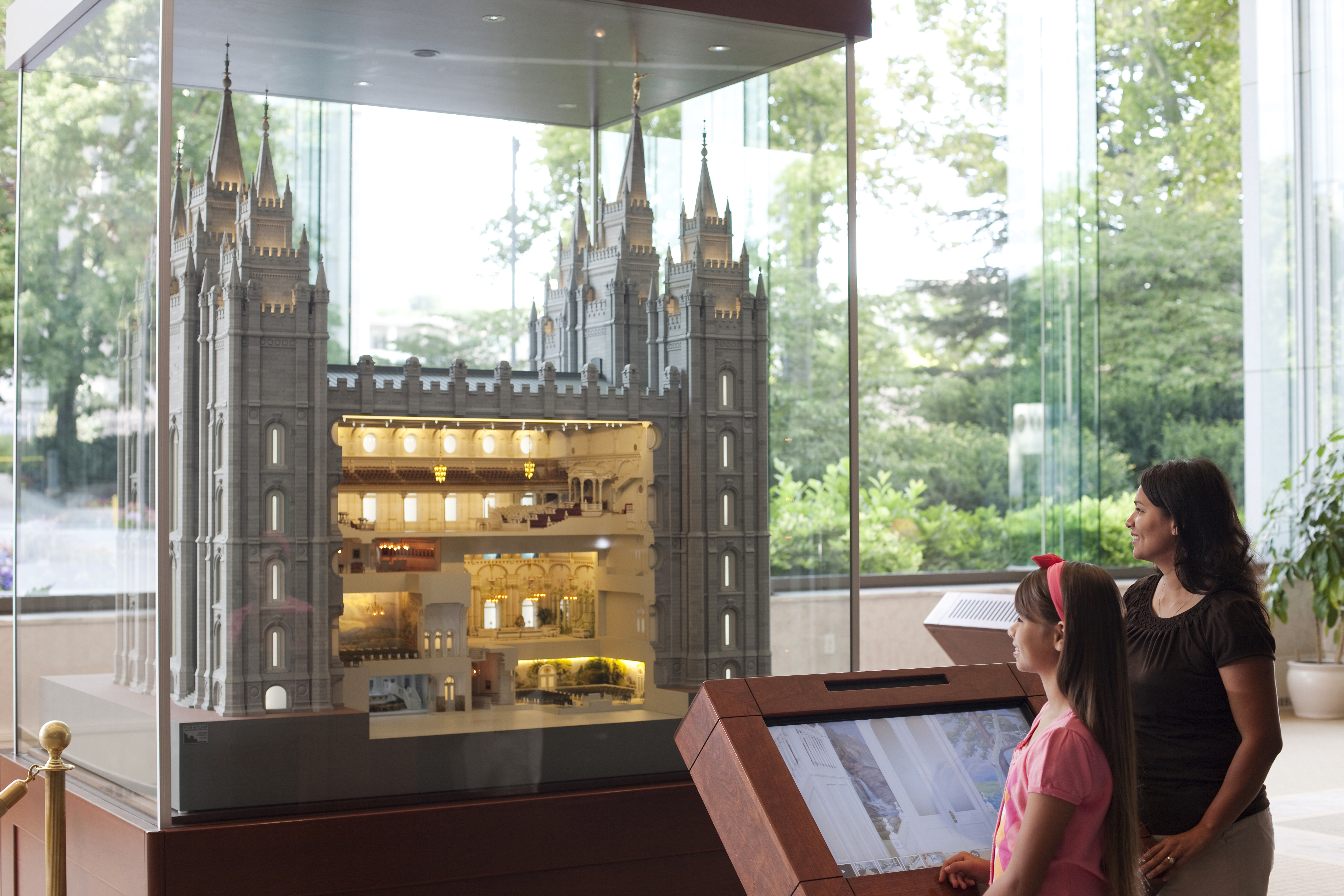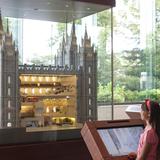 Inside the South Visitors’ Center is a cut-away model of the Salt Lake Temple, as seen in this photo. Displays showing how the temple was built and videos of the Church’s award-winning Homefront public service announcements are available to view.