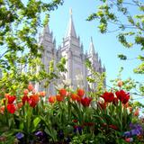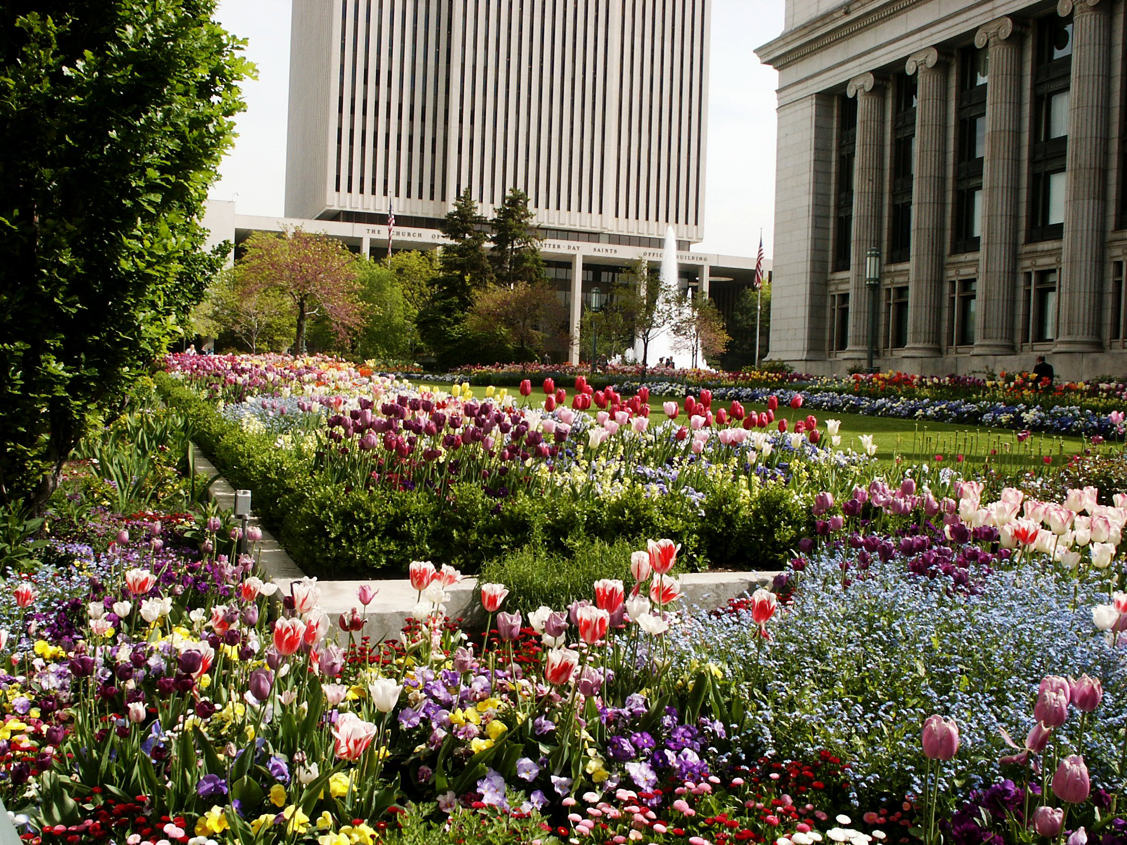 Tulips, other fragrant flowers and trees frame the Salt Lake Temple.