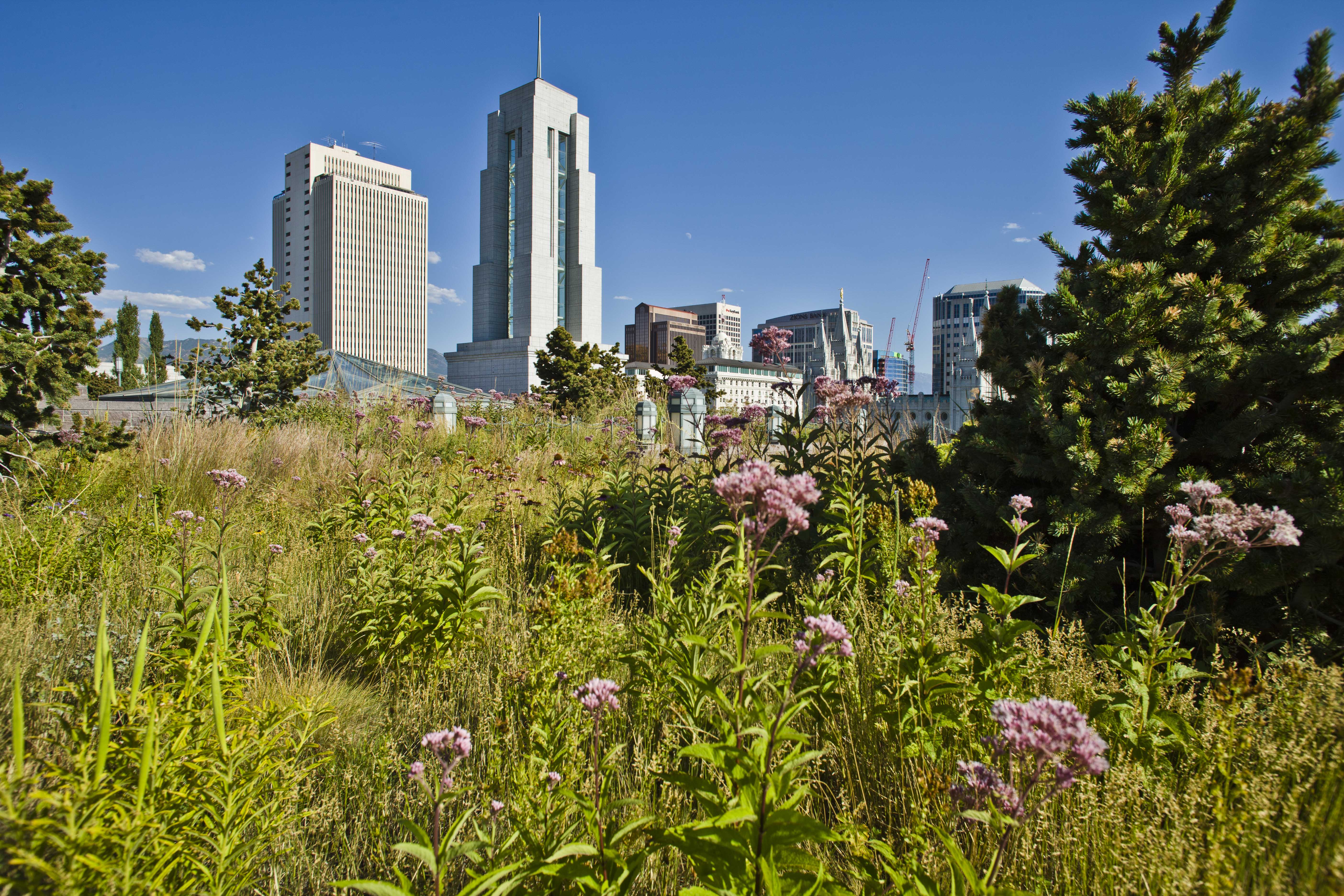 On top of the Conference Center is a four-acre prairie of native and wild grasses, flowers and trees requiring very little water. A prominent feature of the building is the waterfall, which starts at the base of the building’s spire on the roof and cascades down to a pool of recirculated water four stories below. When the building was proposed, then Church President Gordon B. Hinckley wanted residents living above the structure to see a garden, not a typical roof.