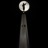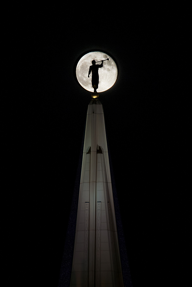The angel Moroni, placed on top of most temples of the Church, is silhouetted against the Arizona moon. This statue is 195 feet above the ground, is 16 1/2 feet tall and was placed atop the Gilbert Arizona Temple 15 May 2012.