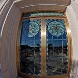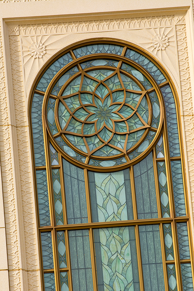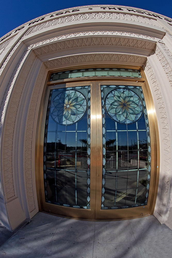 Windows and doors on the Gilbert Arizona Temple carry an artistic theme that features agave, a plant that is native to the deserts of the Southwest, in a color scheme of blue, green and earth tones. Inside the temple, architects used various types of wood including eucalyptus, white oak and painted hardwoods. This photo was taken with a different lens to render this special effect.