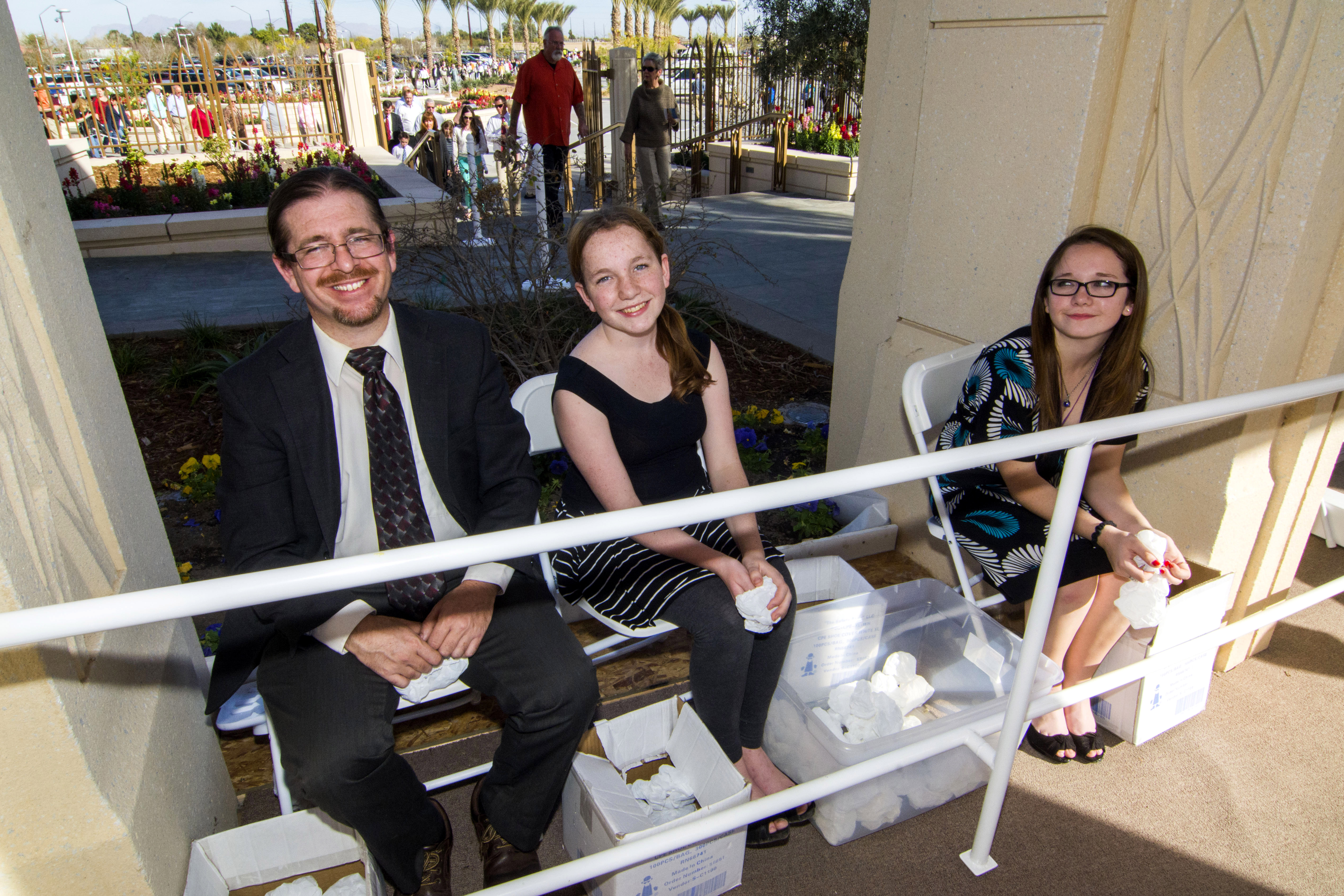 Members of the Church have an opportunity to serve during the open house. Latter-day Saints help place shoe coverings over the shoes of the visitors before they enter the temple. The shoe coverings are to protect the temple carpeting and floors and have no religious significance.