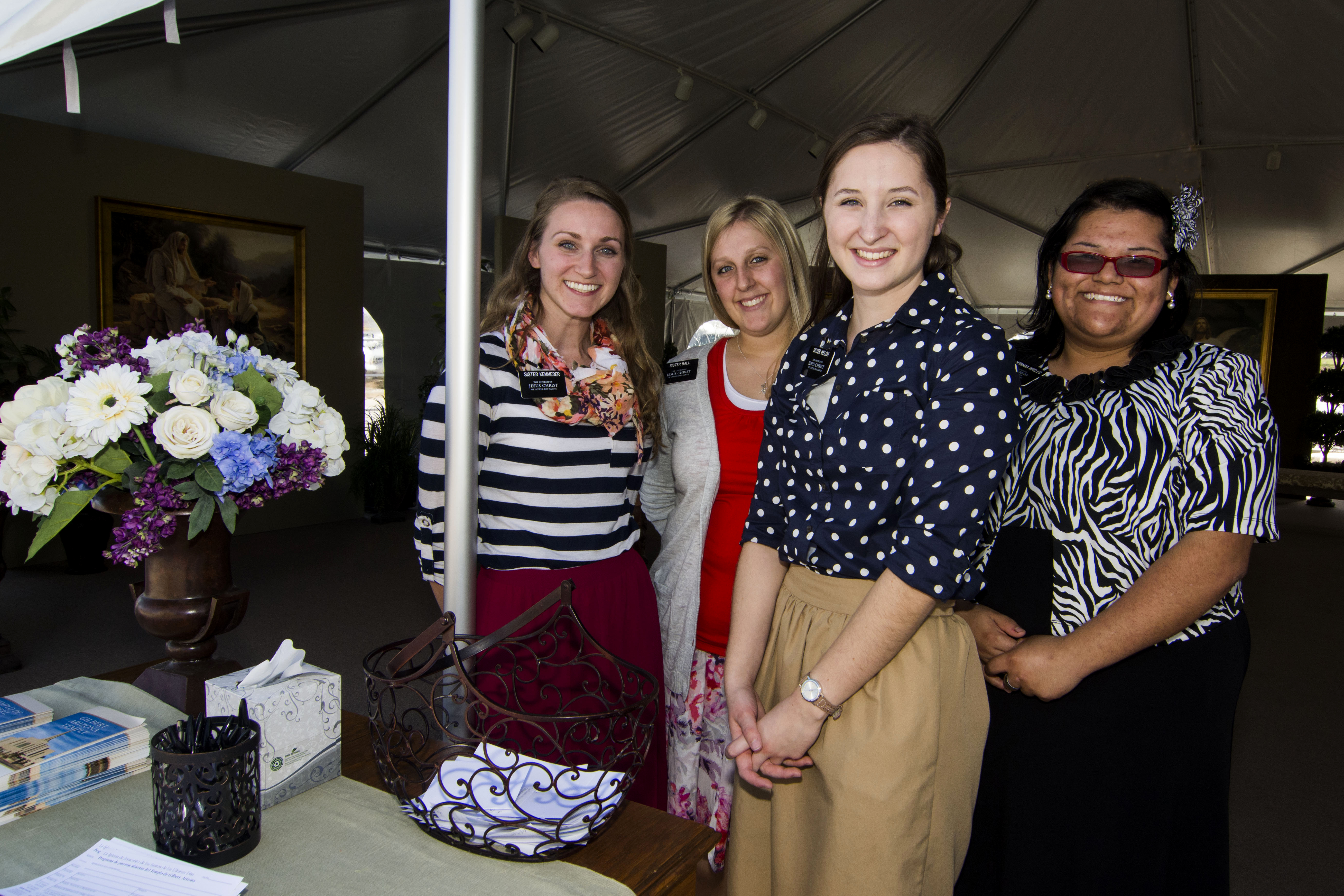 Sister missionaries from the Arizona Gilbert Mission of the Church greet open house visitors during the temple tour. Volunteers can be seen at most temple open houses and are willing to answer visitors’ questions.