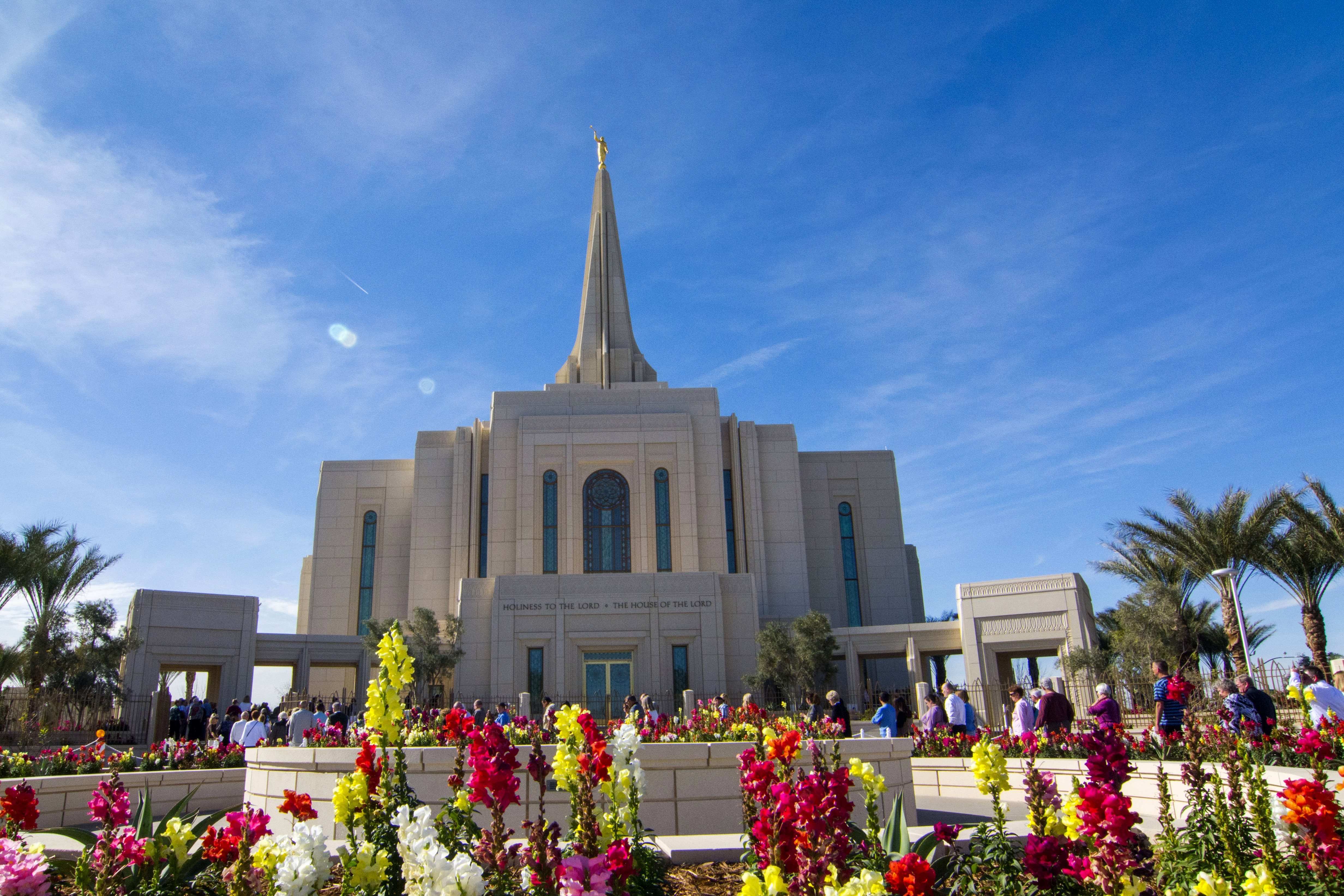Each temple of the Church includes landscaping native to the area in which the temple is located. At the Gilbert Arizona Temple, 84 mature palm trees, shrubs, flowers and other greenery surround the temple to enhance the structure’s beauty.