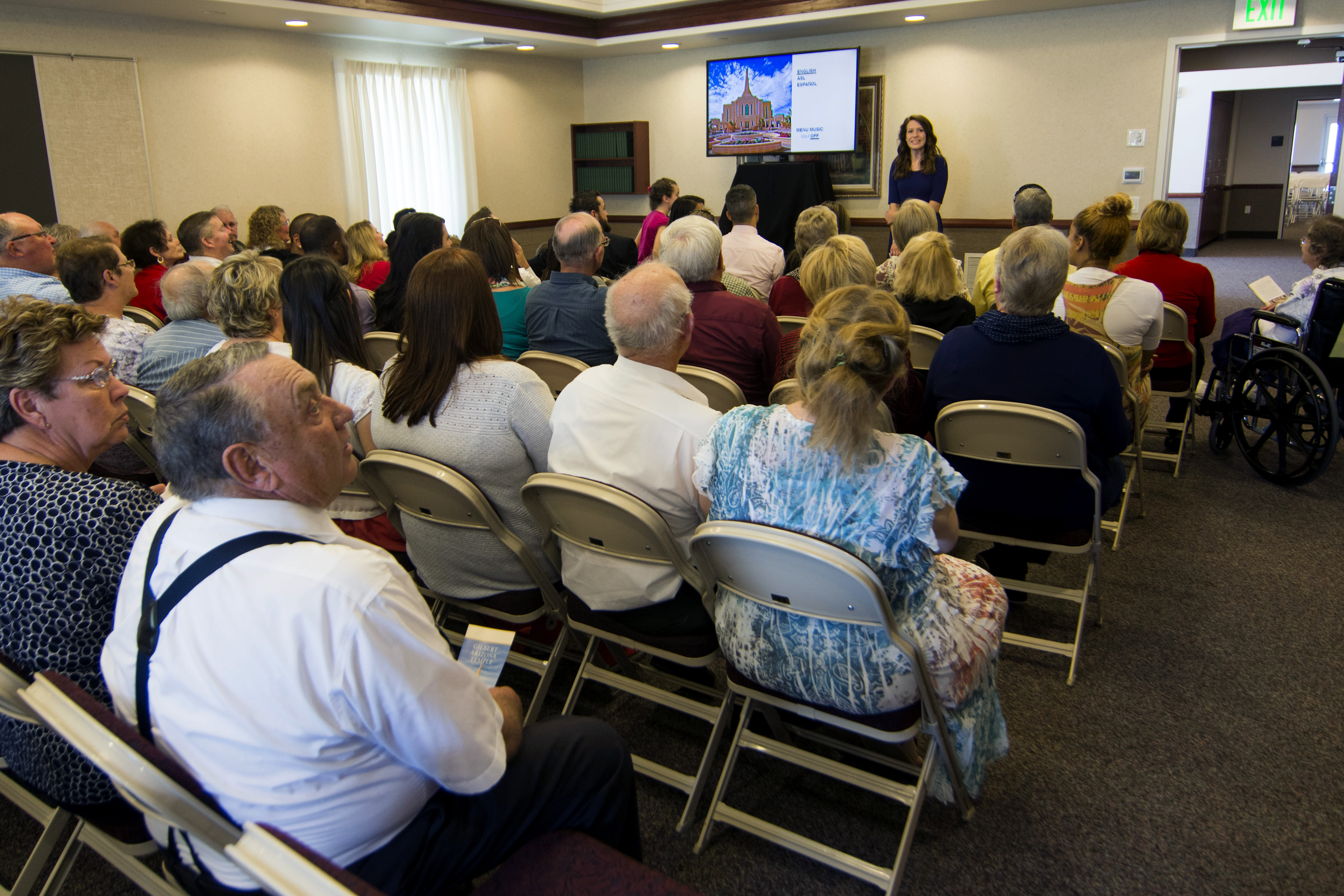 Prior to an open house tour, visitors watch a short presentation on why Mormons build temples and a video showing the interior of the sacred structure. Questions from visitors are encouraged.