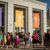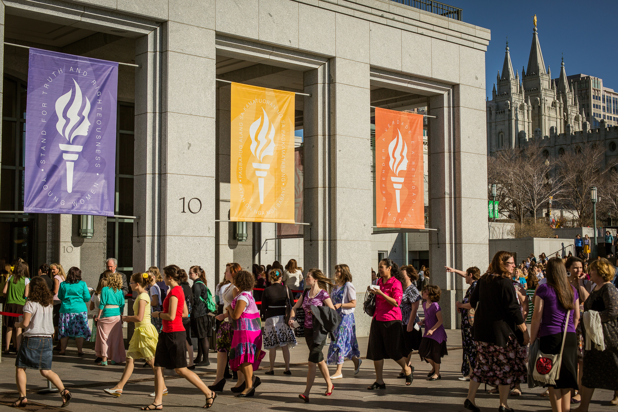 The Conference Center in Salt Lake City welcomed those attending the annual meeting with banners that displayed the Young Women logo, a torch that represents the light of Christ, surrounded by the motto “Stand for Truth and Righteousness.”