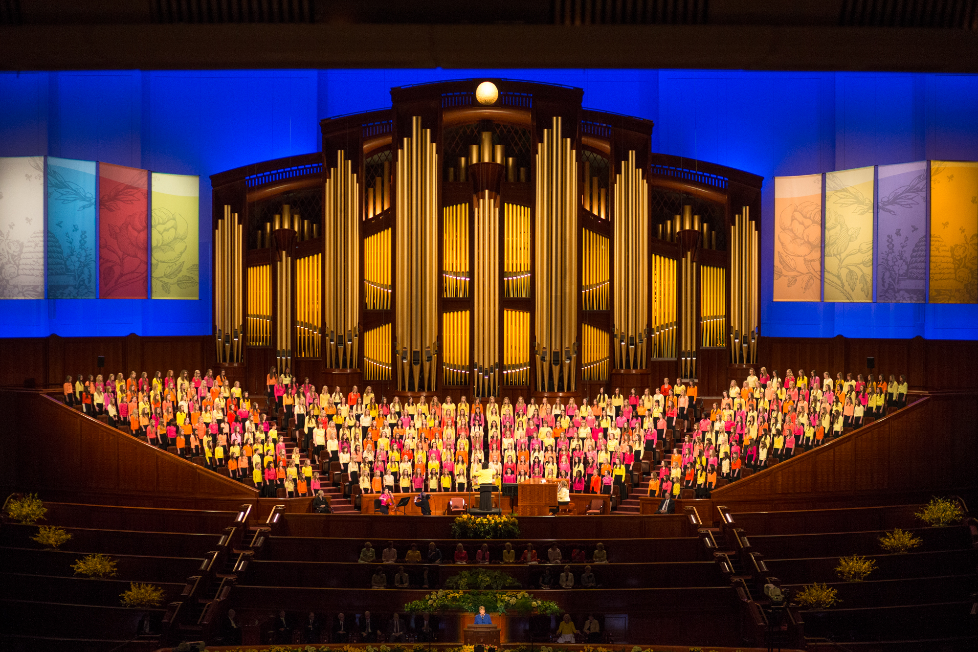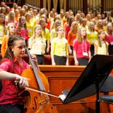 Young women typically provide the musical numbers for each General Young Women Meeting. Breanna Gibson from Highland, Utah, accompanied the choir on her cello.