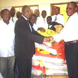 Takoradi Ghana Stake President, Peter Tetteh Dzikpe (right) shakes hands with Mr. Kofi Oti-Frimpong at the presentation. Looking on are members of the Church.