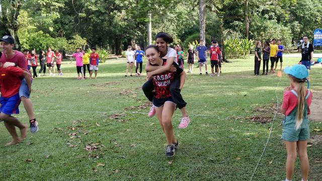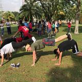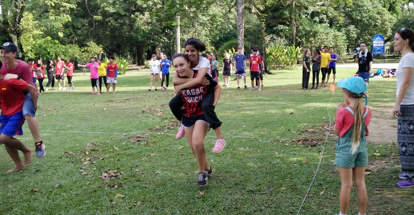 About 30 youth came by bus to a public park where they played a variety of sports games such as relay races, dodgeball and other activities.