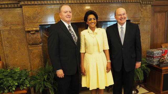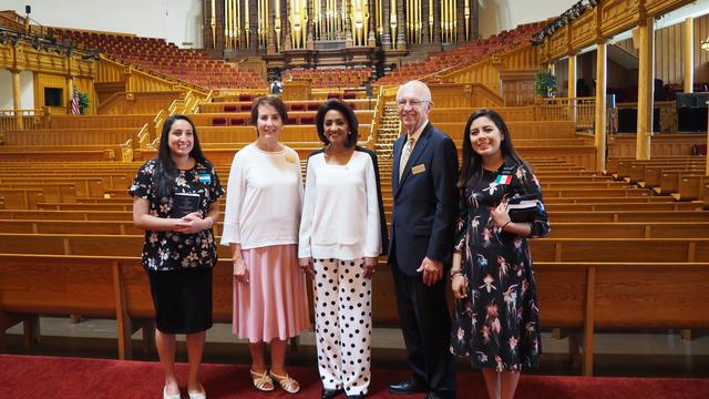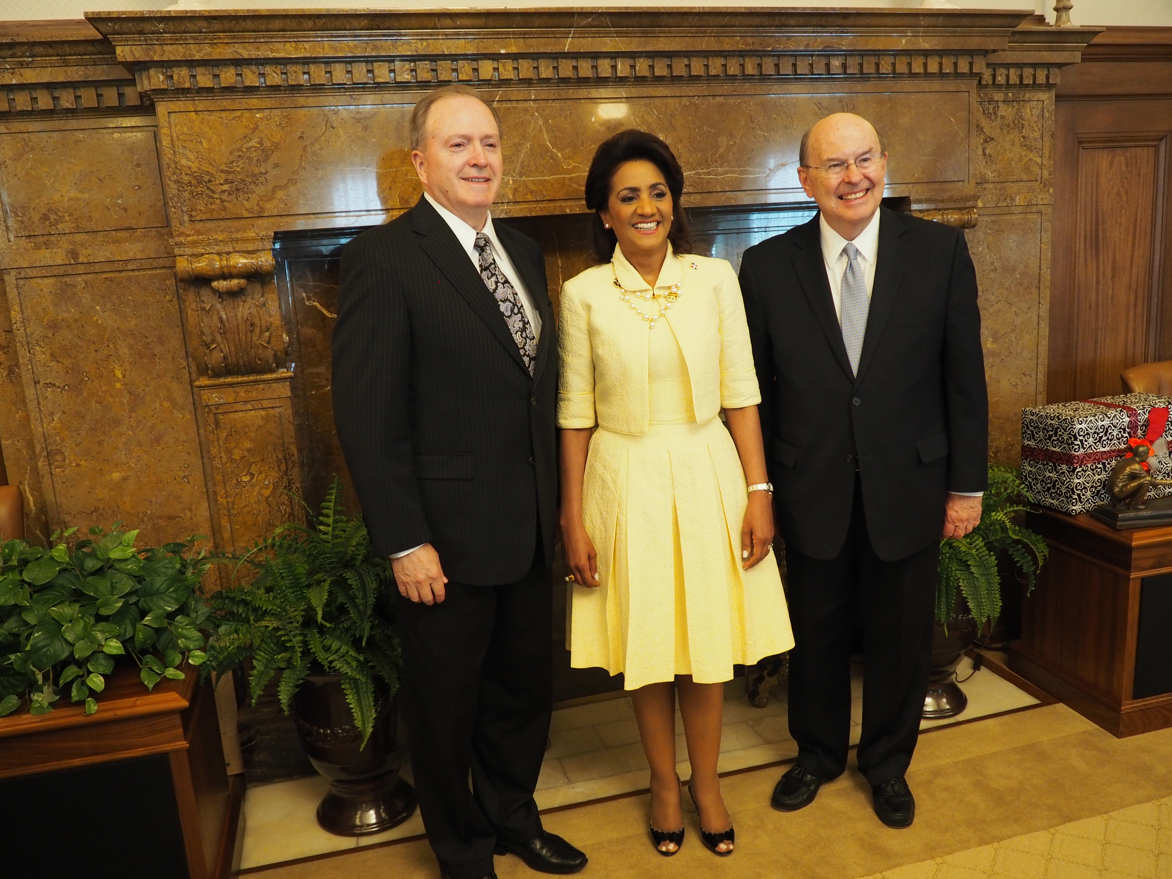 The First Lady of the Dominican Republic came to the world headquarters of The Church of Jesus Christ of Latter-day Saints recently. “We are impressed by its organization, how they operate and their social commitment in helping those in need in our country,” said Mrs. Montilla de Medina. She met with Elder Quentin L. Cook of the Quorum of the Twelve Apostles and Elder Lynn G. Robbins of the Presidency of the Seventy. She also visited the Church’s humanitarian center and other sites.