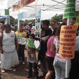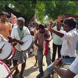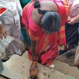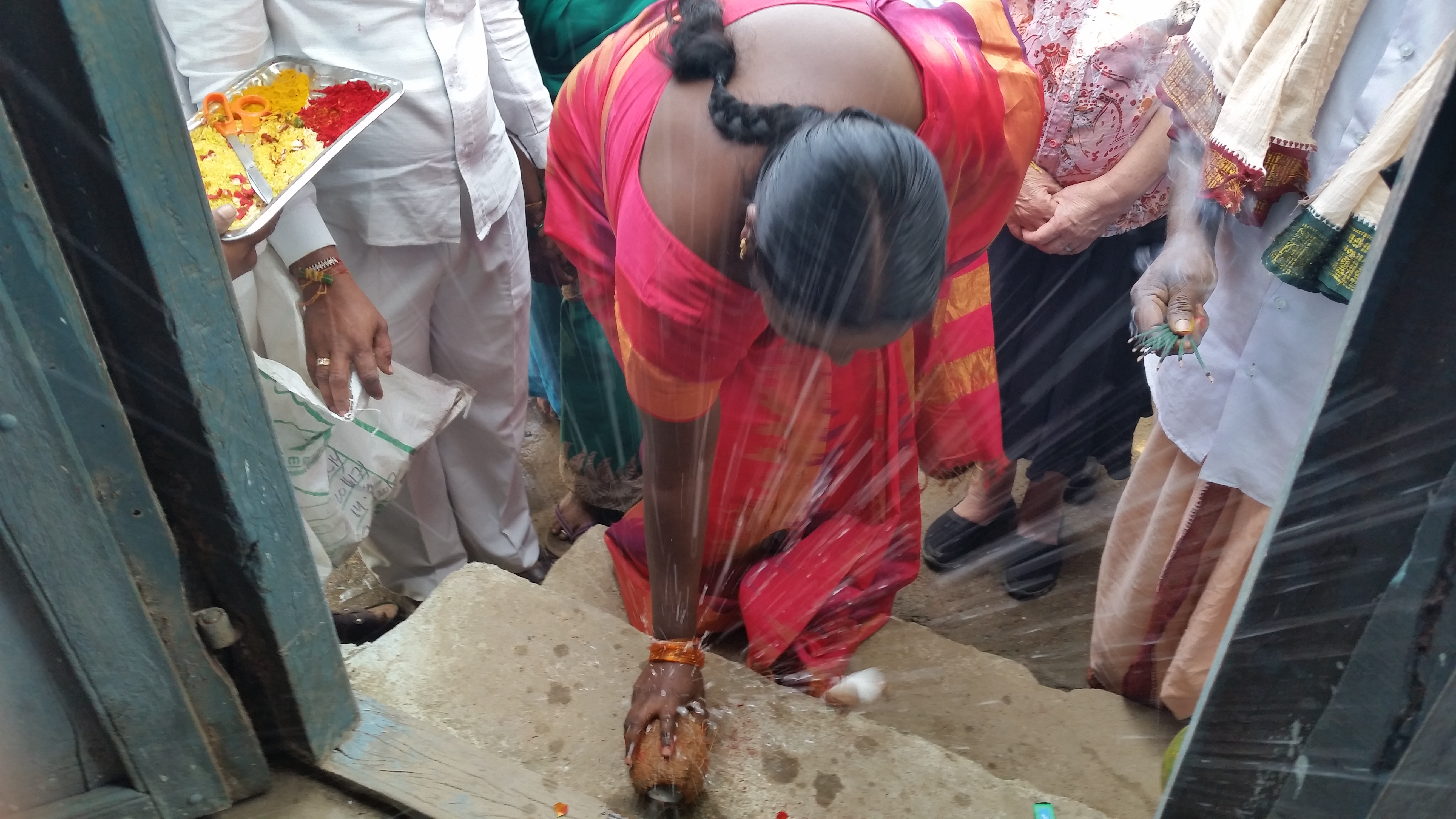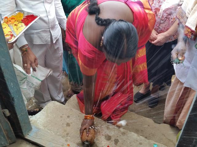 In total, 53 villages are now using the RO systems, and by this January, 70 villages will have working units. There was a lot of celebrating for this new development. This woman is cracking a coconut on the steps of a building. Coconut water symbolizes purity.