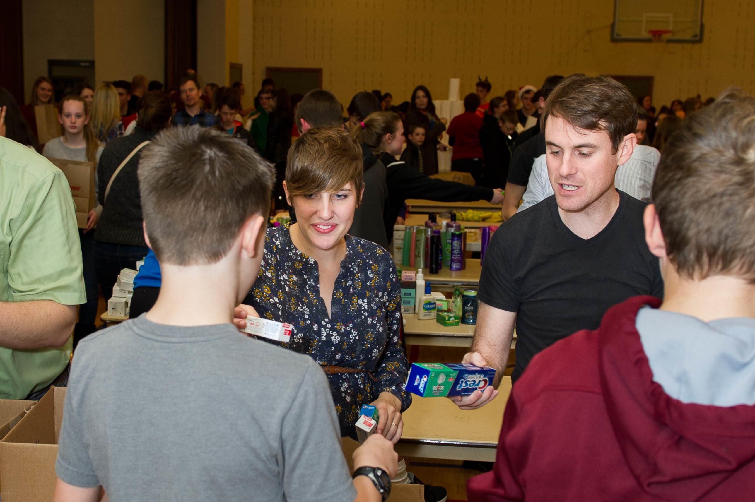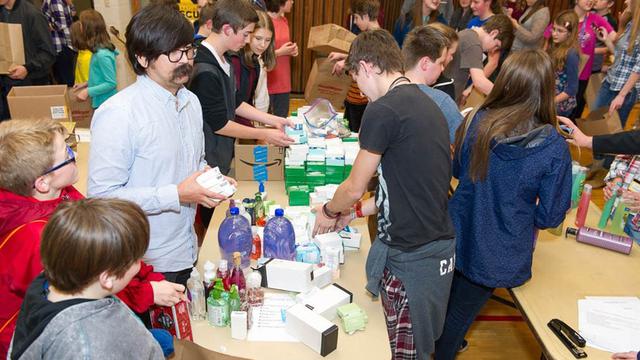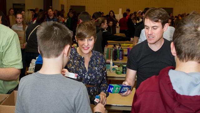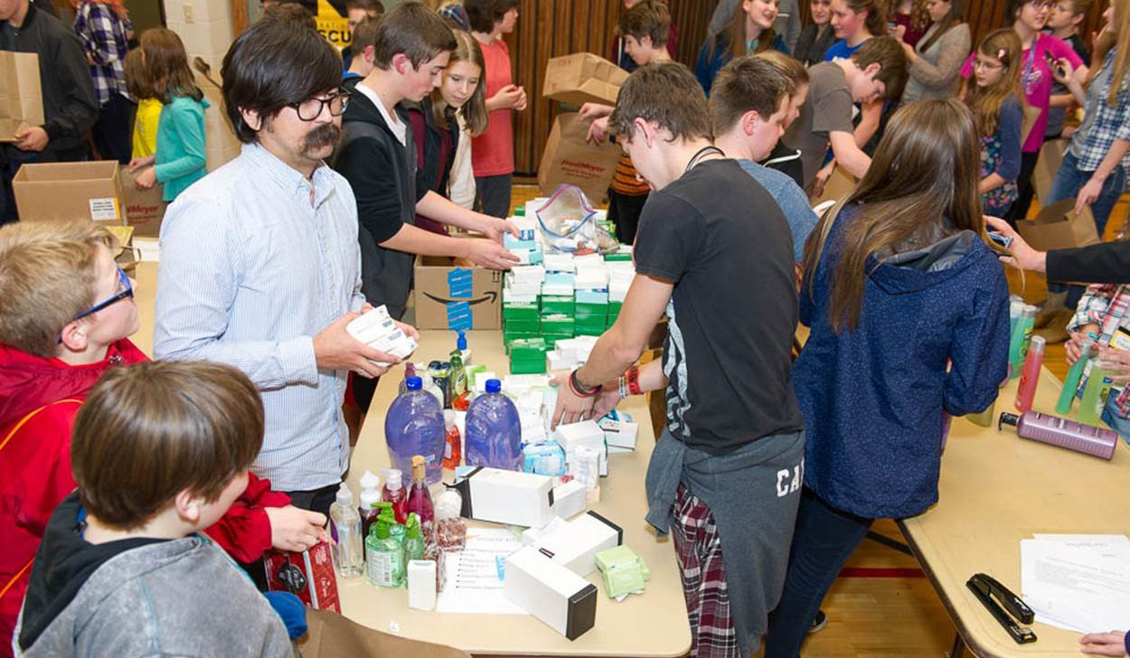 Cast members from the popular public television program “Studio C” left the TV stage to give service in a project with Latter-day Saint youth in Redmond, Washington, in November. They assembled hygiene and household cleaning kits for refugee families.