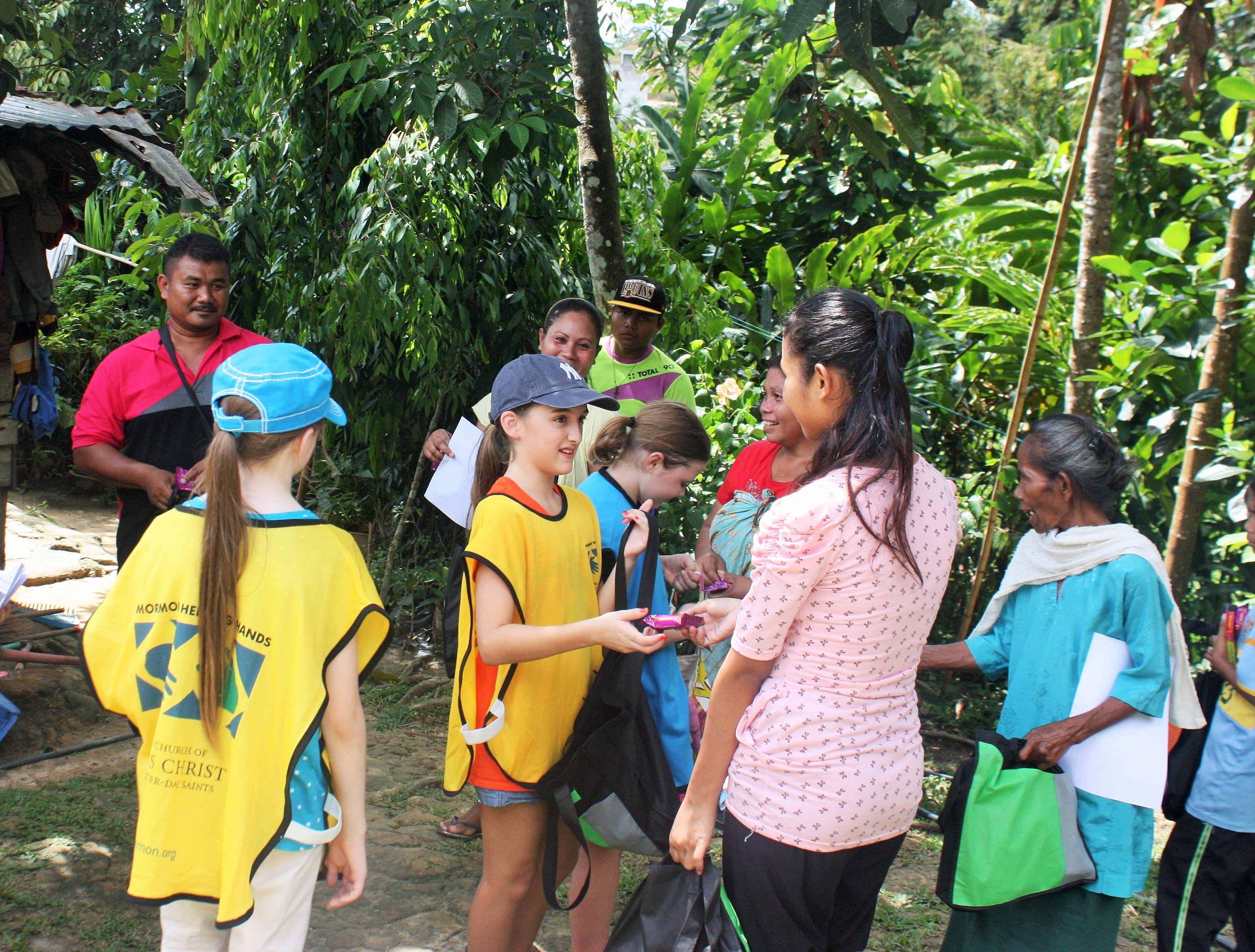 Latter-day Saints in their familiar yellow Mormon Helping Hands vests distributed hygiene products and school supplies November 29 to two villages in Malaysia.