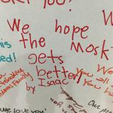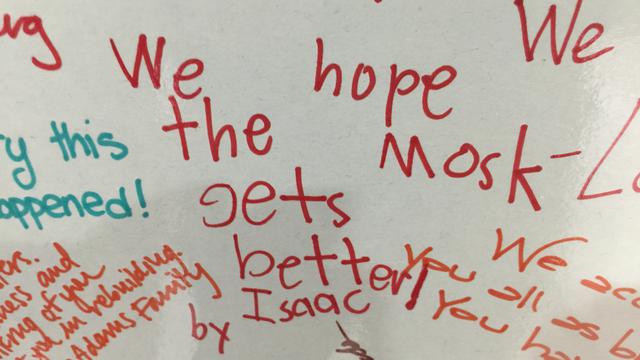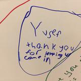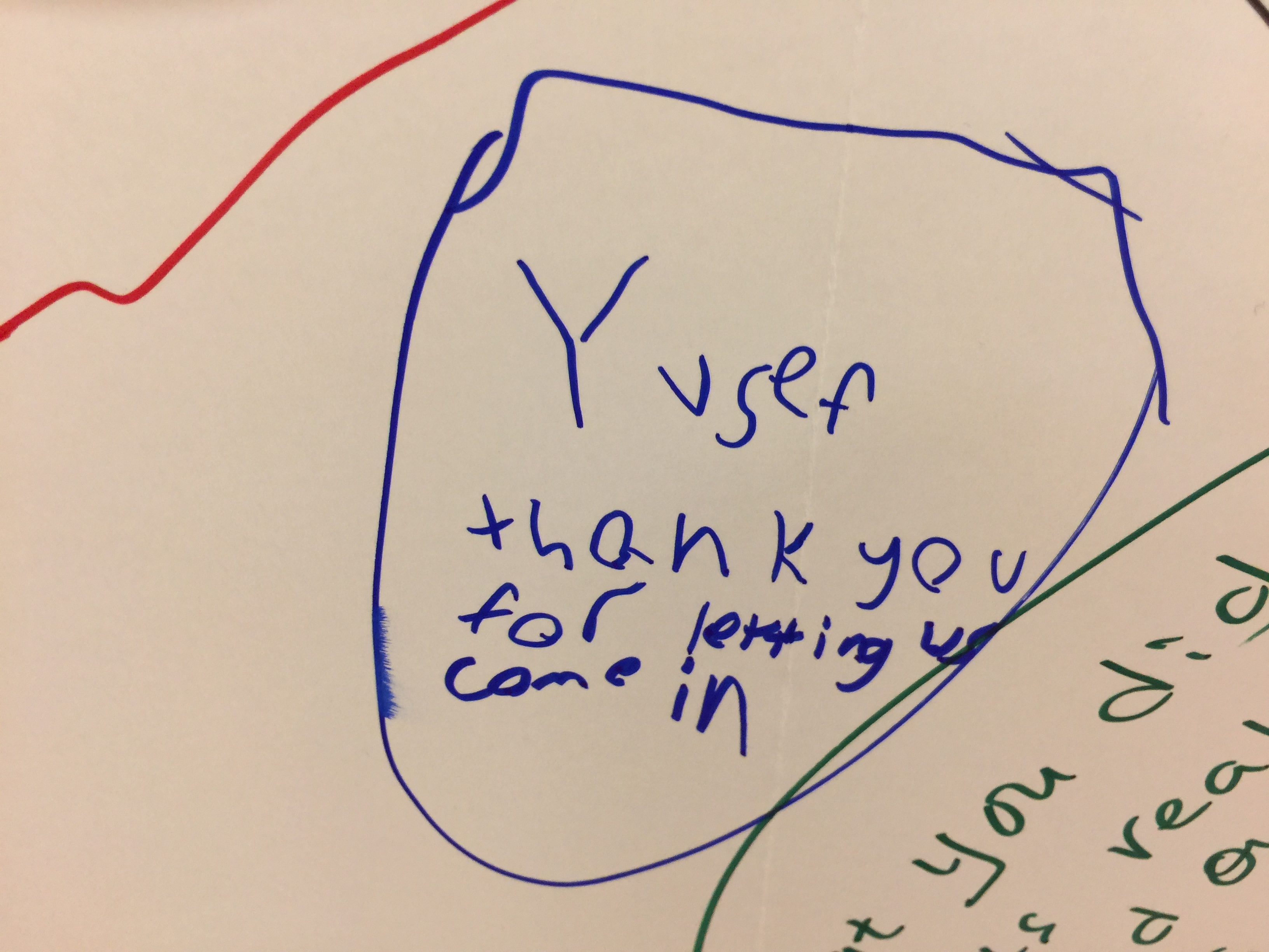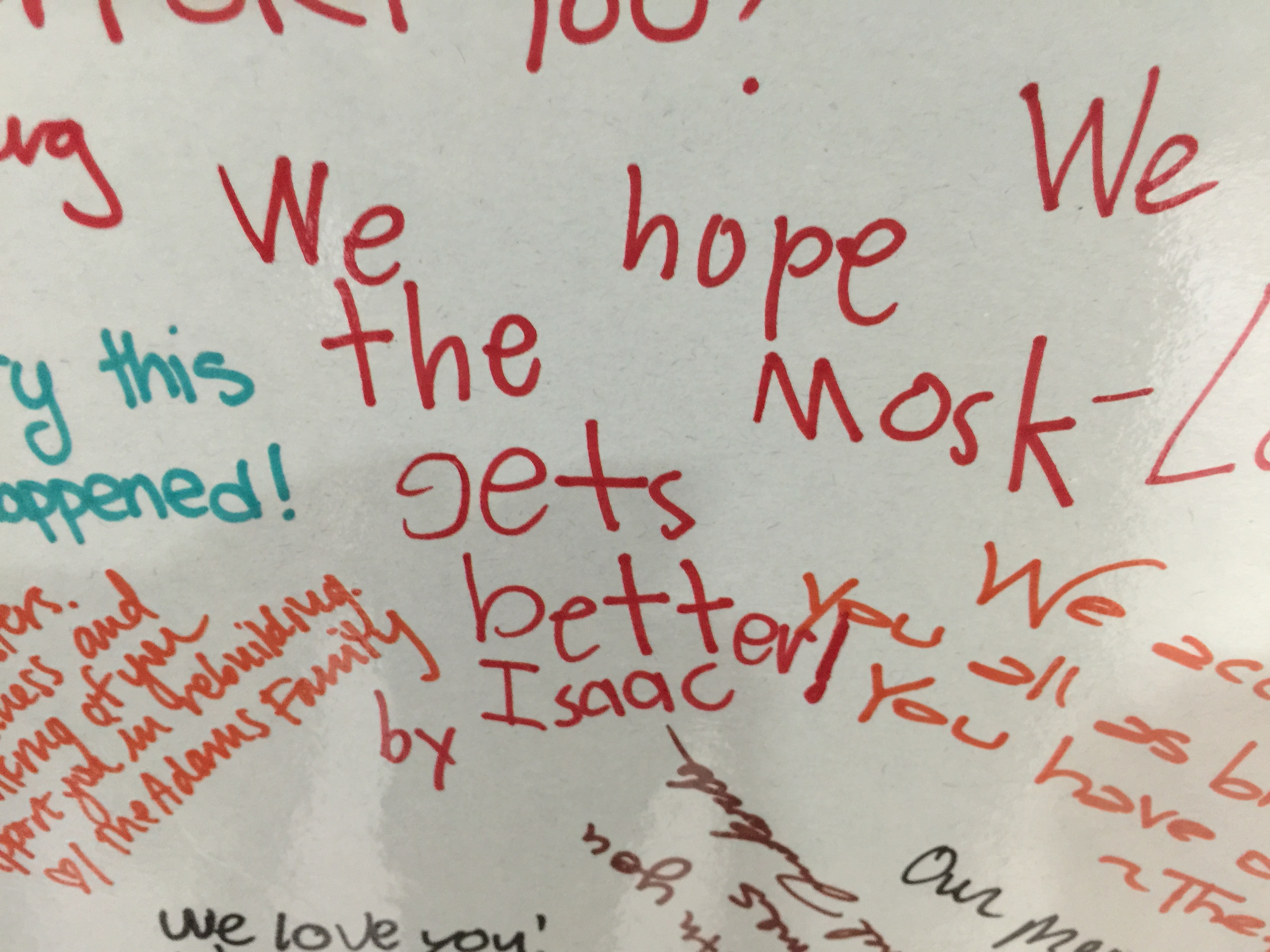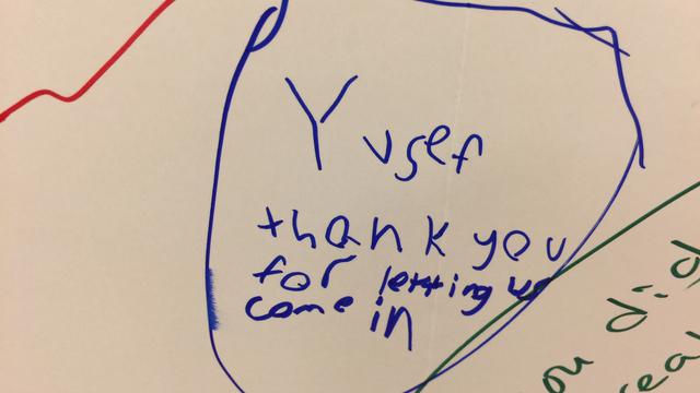 Mormon and Muslim children wrote thank you messages on a white board in the meetinghouse