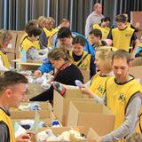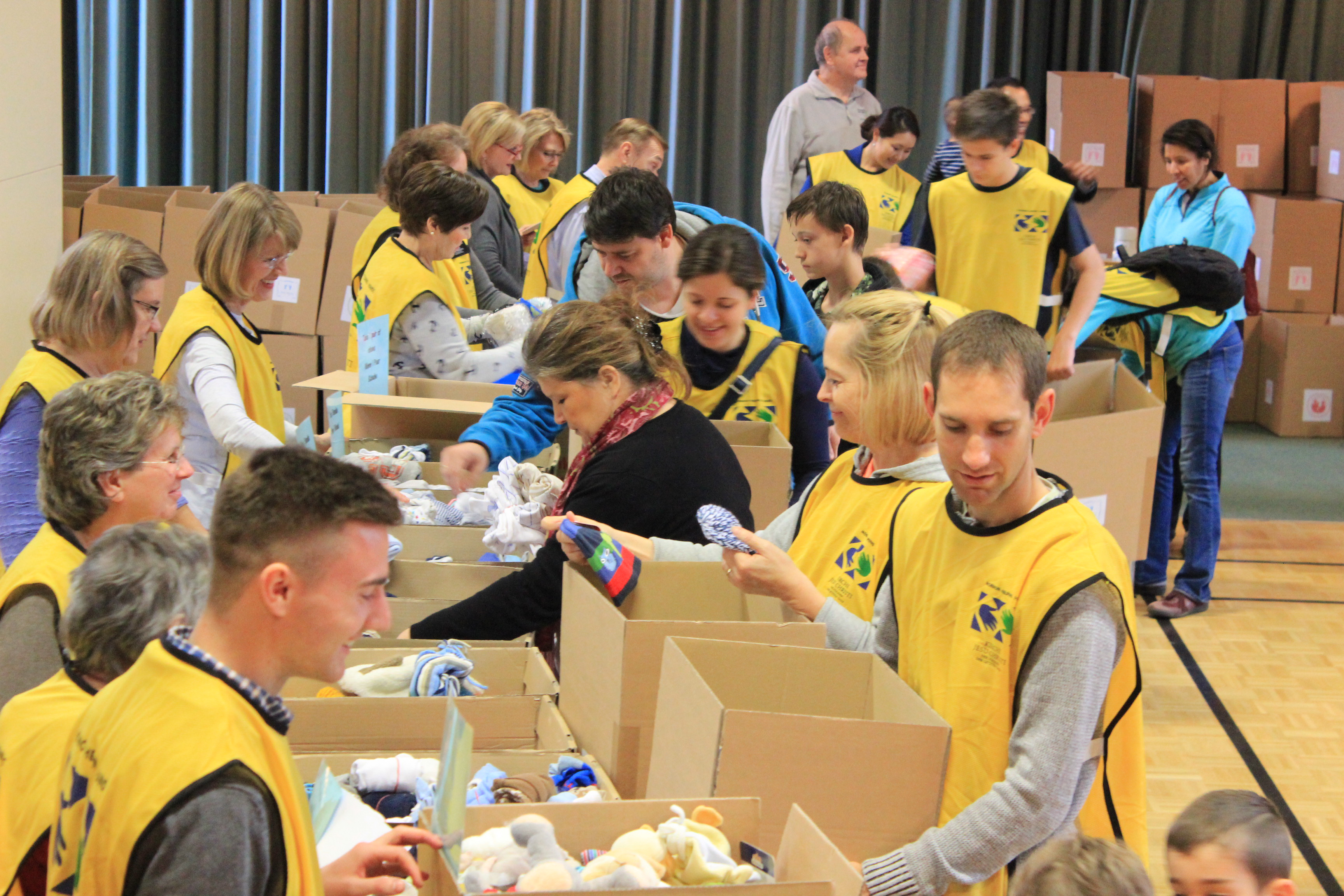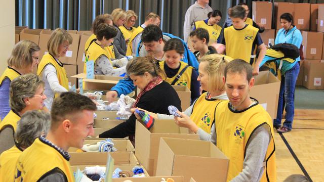 An estimated 100 Mormon volunteers assembled baby supplies for young refugee mothers in Frankfurt. Latter-day Saints set up an efficient assembly line of socks, toys, diapers and other items for little boys and girls.