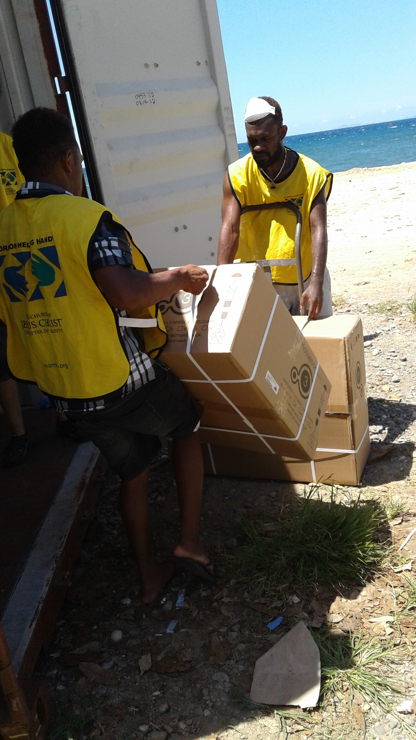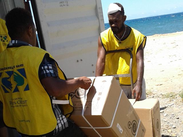 Latter-day Saint volunteers in Honiara donned their yellow Mormon Helping Hands vests to assemble the wheelchairs.