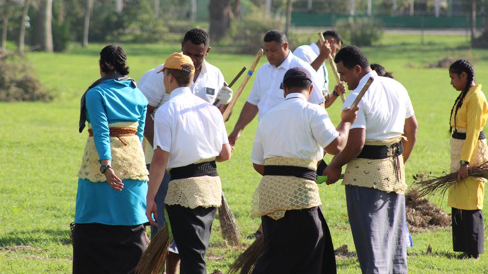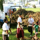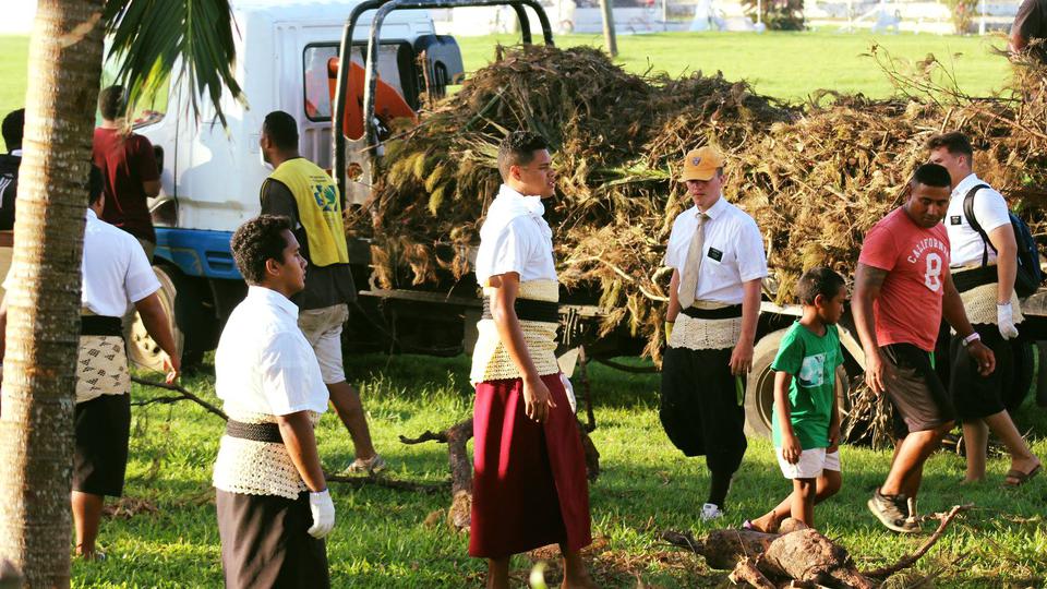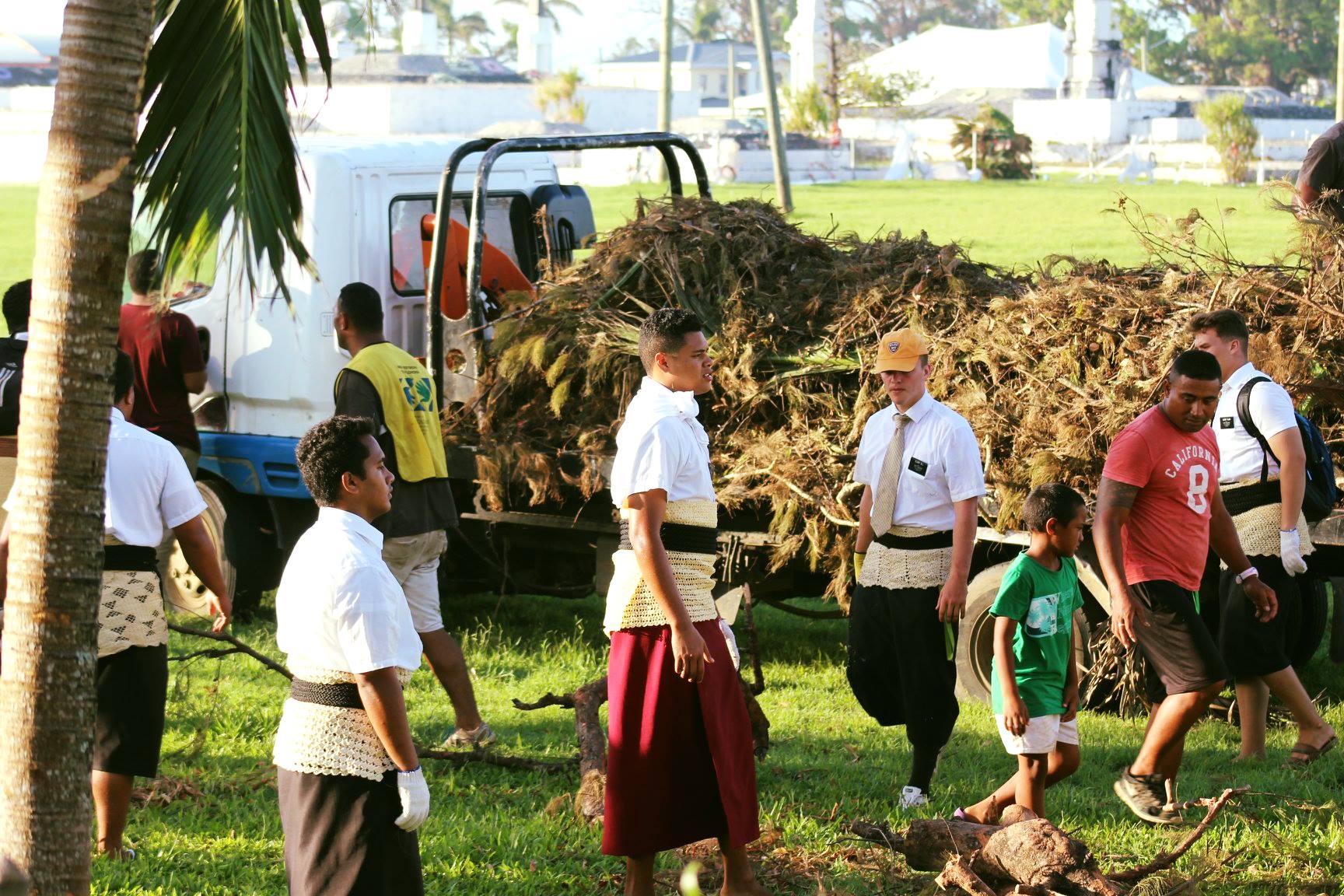 Within just seven days after Cyclone Gita hit Tonga, more than 40 Mormon missionaries, dressed in traditional missionary attire, helped clean the Royal Tombs of Mala’e Kula.