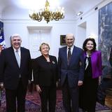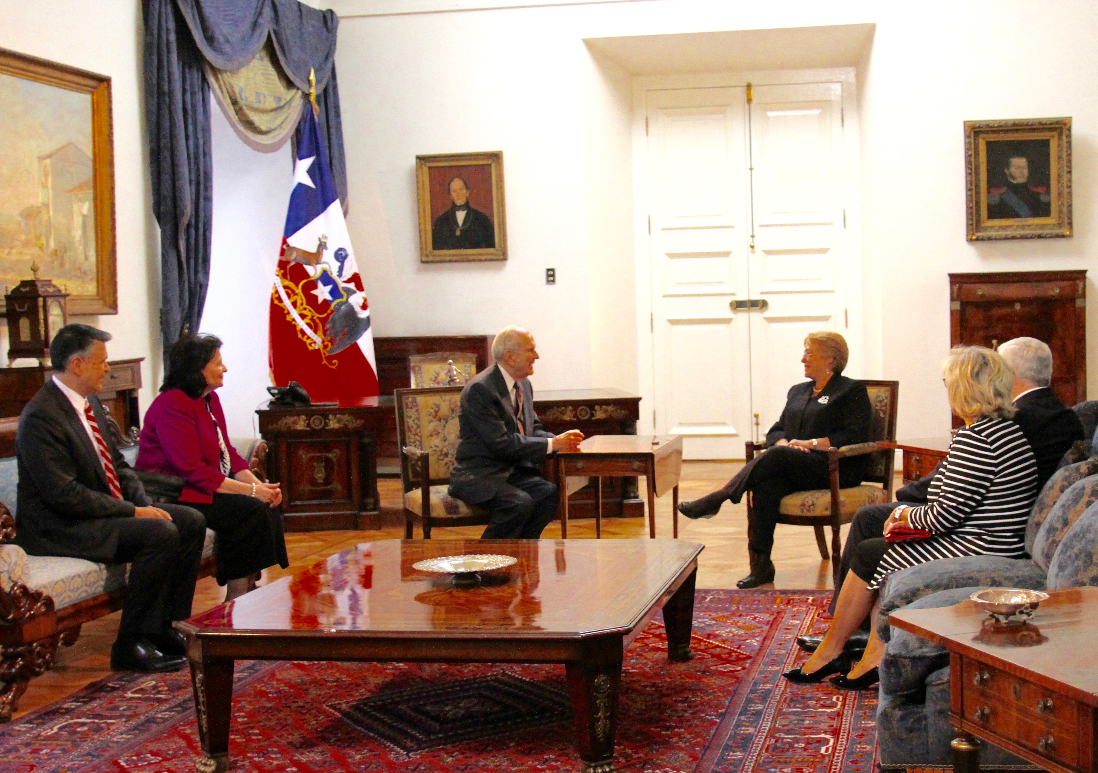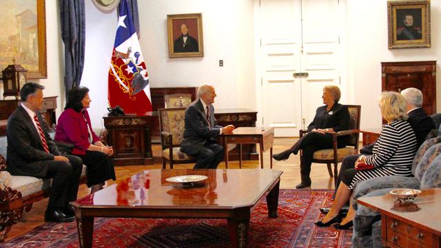 Chilean President Michelle Bachelet welcomed Russell M. Nelson, president of the Quorum of the Twelve Apostles, and his wife, Wendy Watson Nelson, at the Audience Hall of the Palace of La Moneda. Two other Church leaders accompanied President Nelson in the visit.