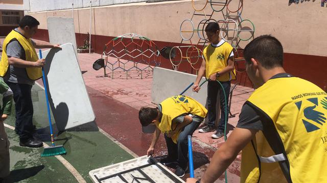 They wore the Mormon Helping Hands yellow vests and shirts while cleaning walls, floors and windows around health centers, and cleaning and landscaping gardens in public schools.