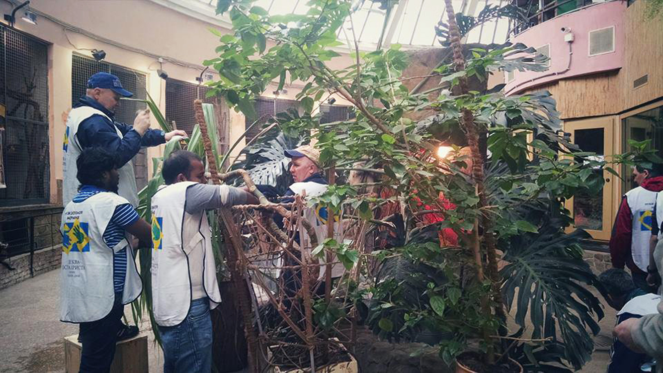 The volunteers cleaned the the ape pavillion at the Kharkiv Zoo in Ukraine. The Church also gave the zoo nursery beautiful flowers to dress up the habitat.