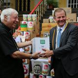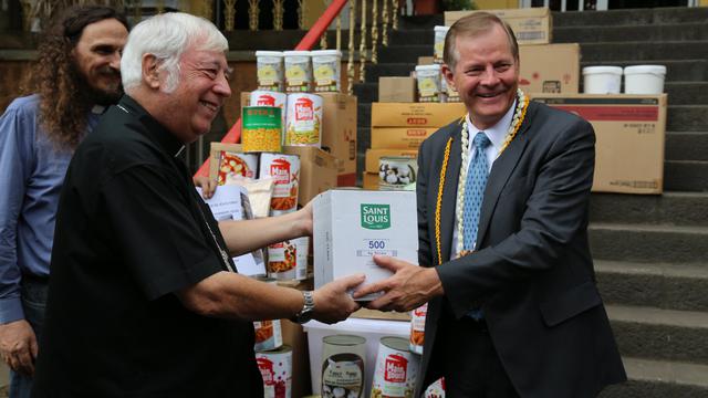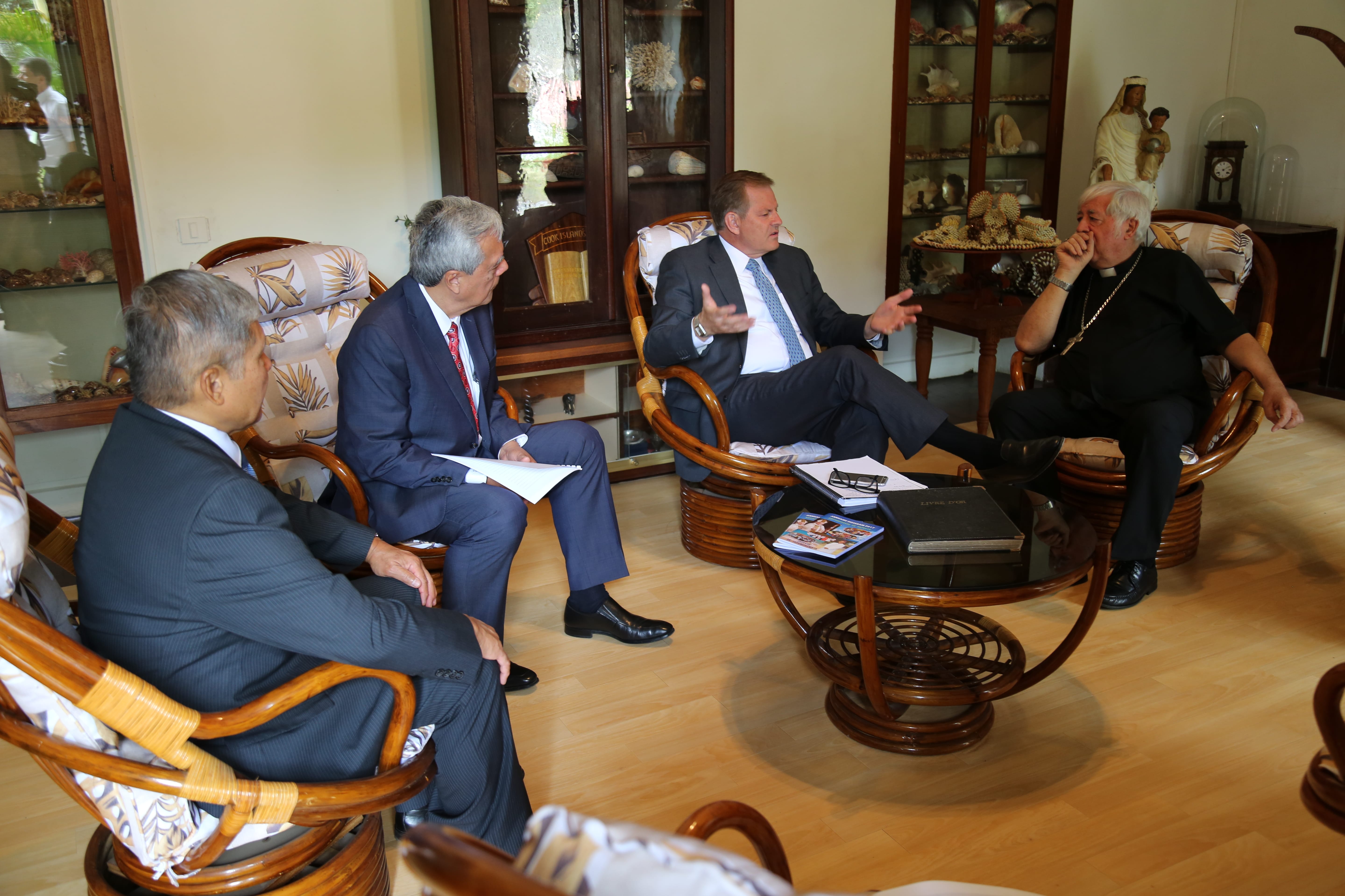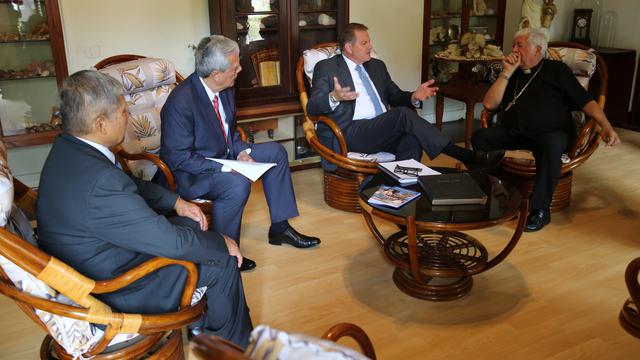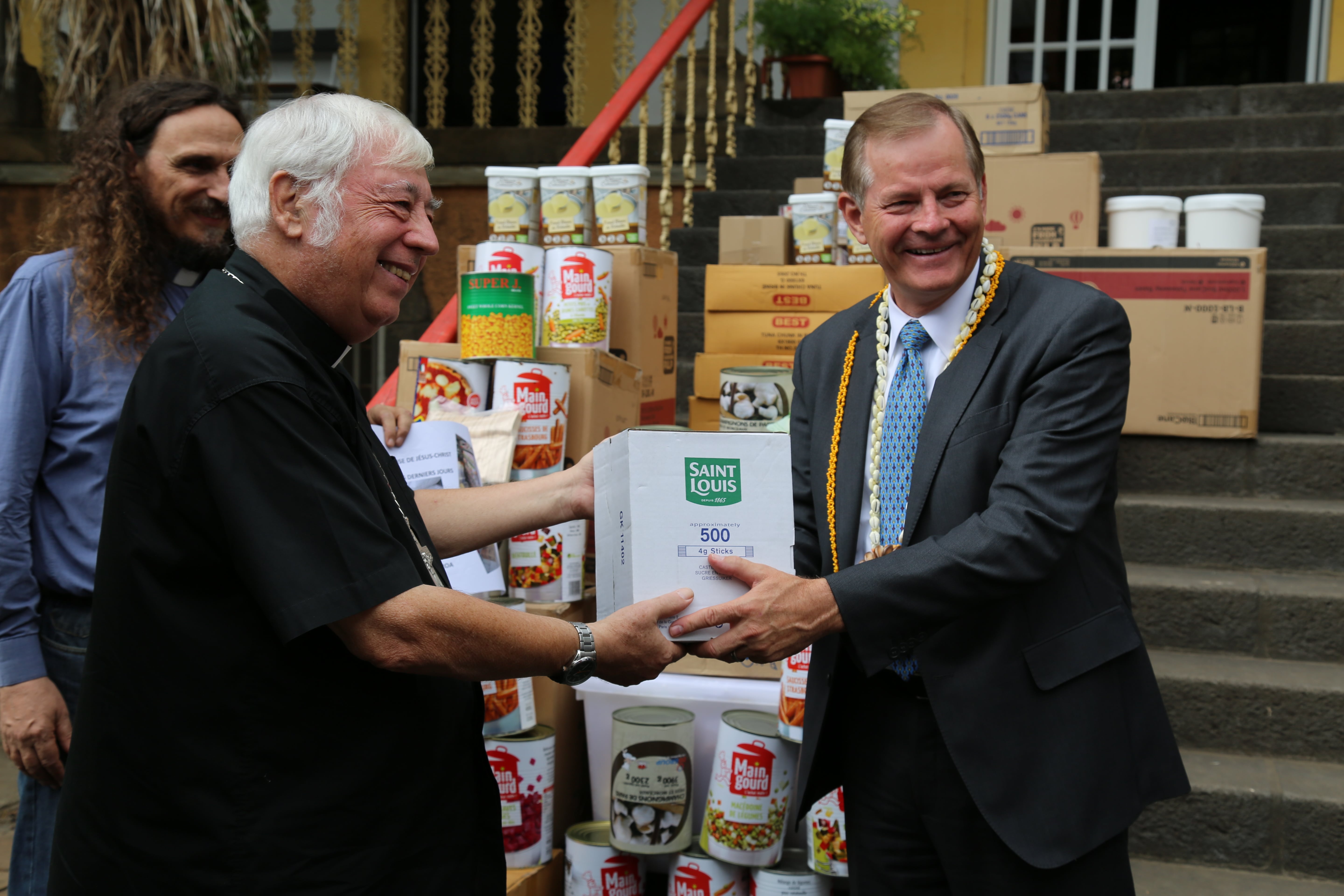 A Mormon apostle and other Church leaders met with local Catholic leaders to donate food and show support to relieve hunger in Tahiti.