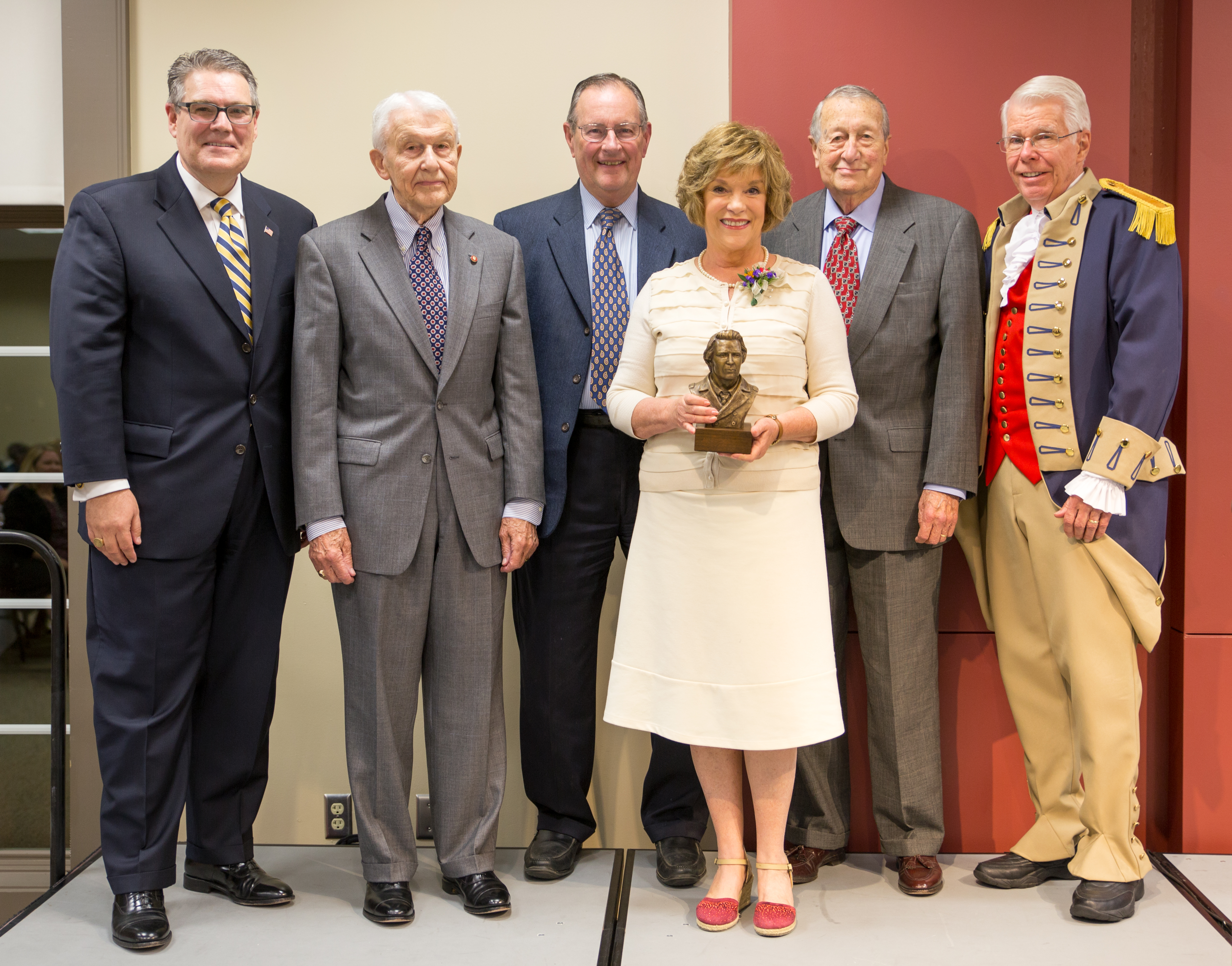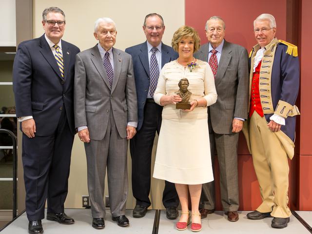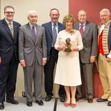 (Left to right) Clint Patterson, Chair of the Alexander Doniphan Community Service and Leadership Foundation, past recipients General Robert Arter, Retired; John Dillingham; Ray Brock; Dr. Christian Sizemore pose with Dr. Susan Easton Black as she receives the award. Dr. Sizemore was part of the color guard from the Sons of the American Revolution, who presented the colors.All rights reserved.