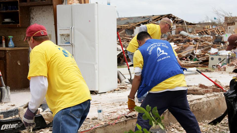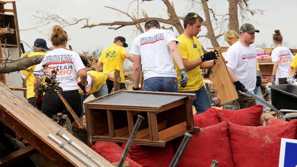 Throughout the Memorial Day weekend, volunteer groups including the American Red Cross, Catholic Charities, Baptist charity groups and other organizations worked cooperatively to help tornado victims. Baptist charity Mercy Chefs served meals to the hungry including Latter-day Saint Helping Hands volunteers working in different parts of the devastation. The charity is made up of professional chefs who donate their time to prepare hot gourmet meals for victims and volunteers.