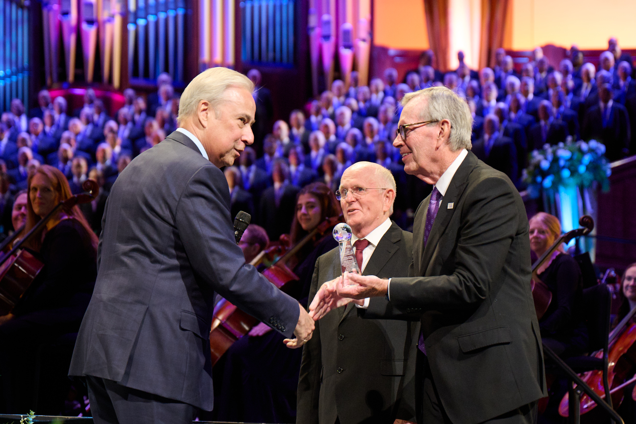 Perry Sook, joint board chairman of the National Association of Broadcasters, presents a commemorative award to Tabernacle Choir President, Michael O. Leavitt, in recognition of the remarkable achievements of The Tabernacle Choir at Temple Square’s weekly program, “Music & the Spoken Word.”2025 by Intellectual Reserve, Inc. All rights reserved.Perry Sook, joint board chairman of the National Association of Broadcasters, said the 5,000th episode of “Music and the Spoken Word” represents more than longevity and international reach.