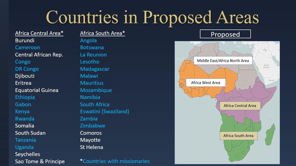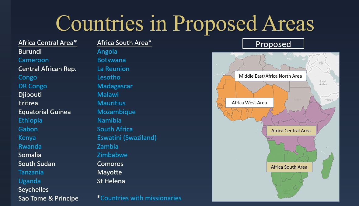 A June 2019 letter from the Church’s First Presidency to General Authorities, Area Seventies, General Officers and stake presidents announced the division of the Church’s Africa Southeast Area into the Africa South Area and the Africa Central Area. An area is an administrative unit typically composed of multiple stakes (similar to a diocese) and missions (full-time missionaries serve in a geographic area).