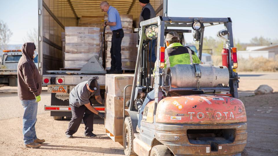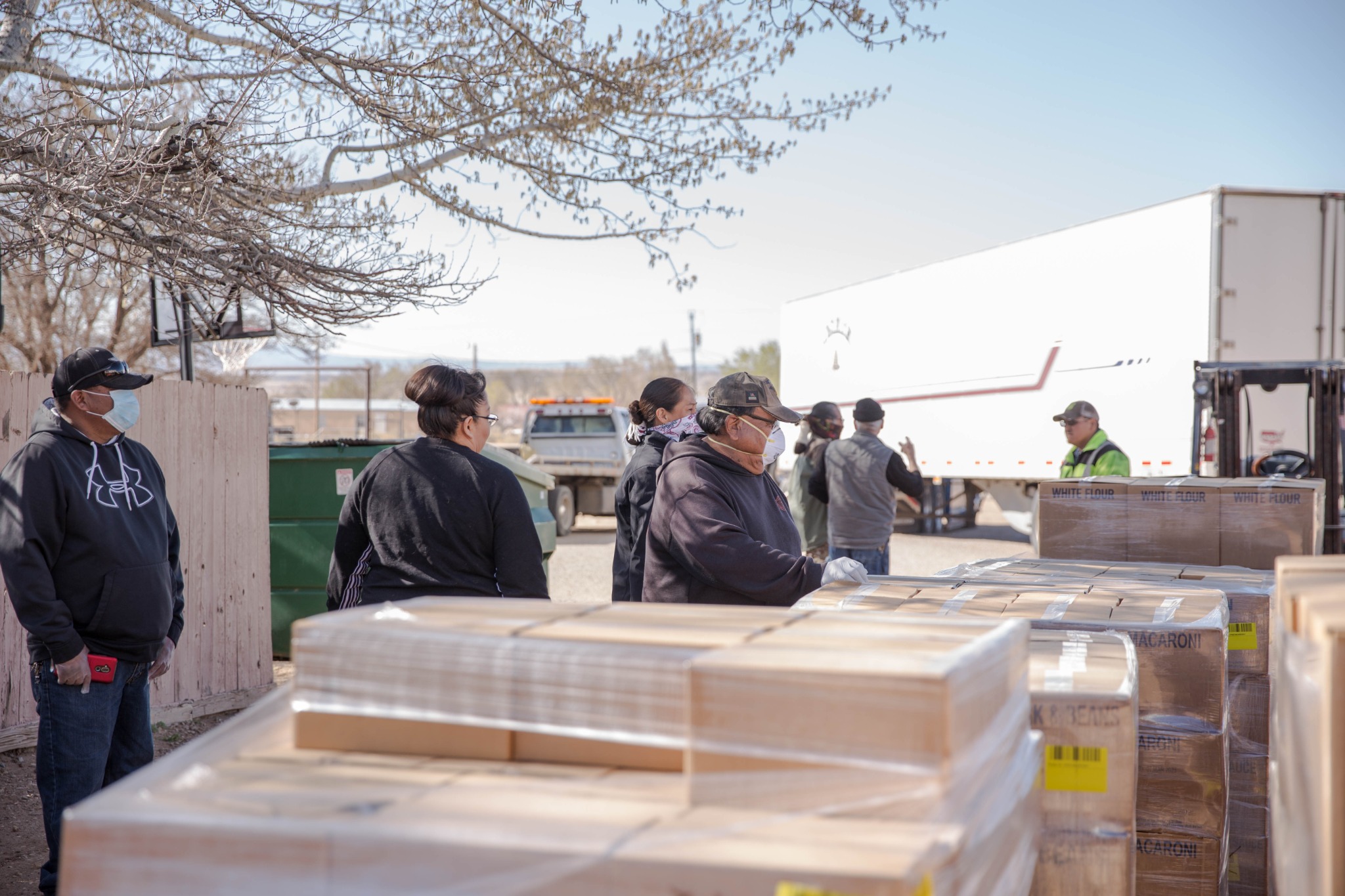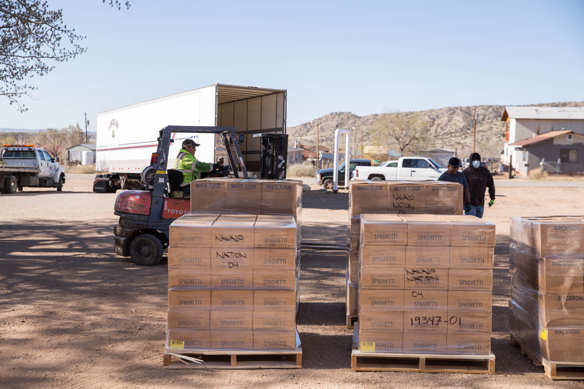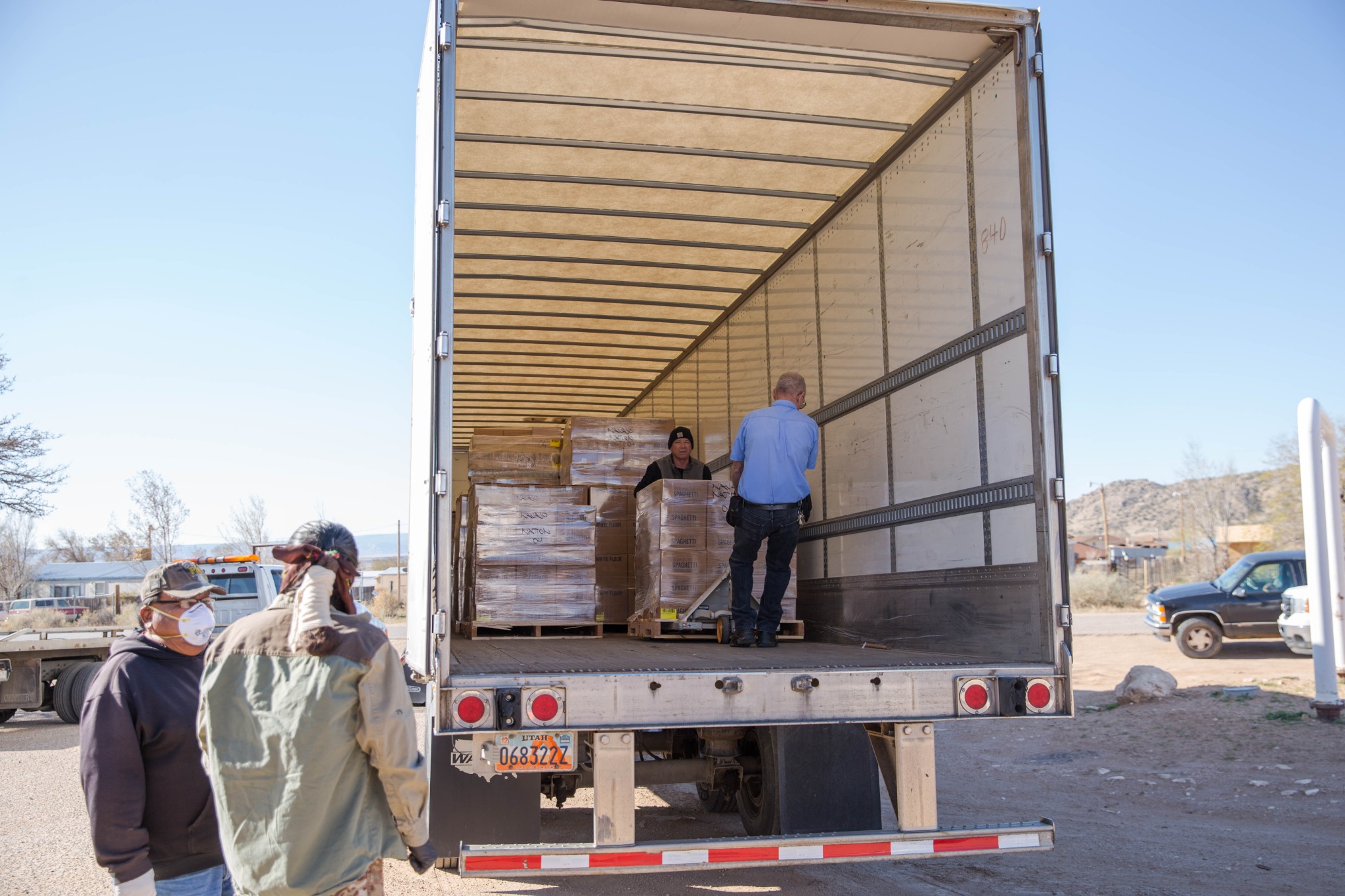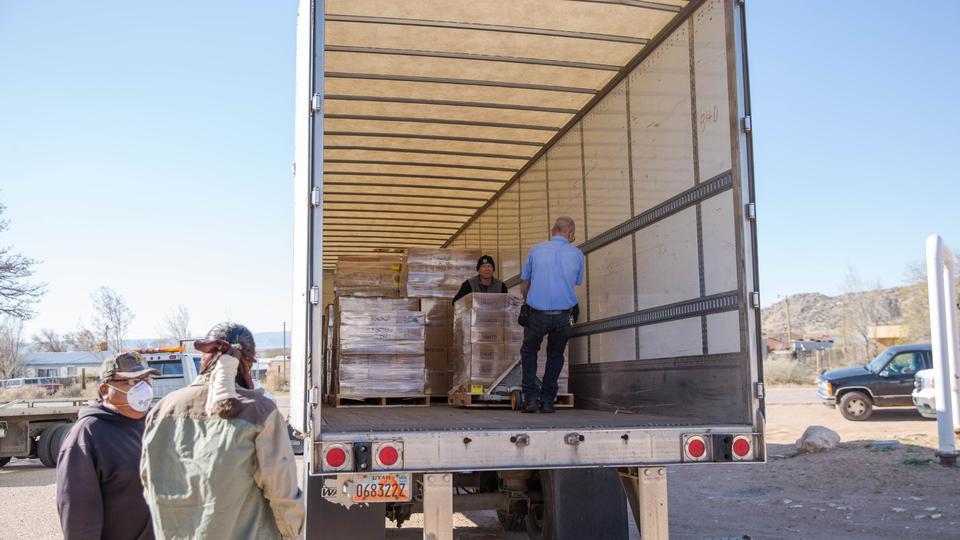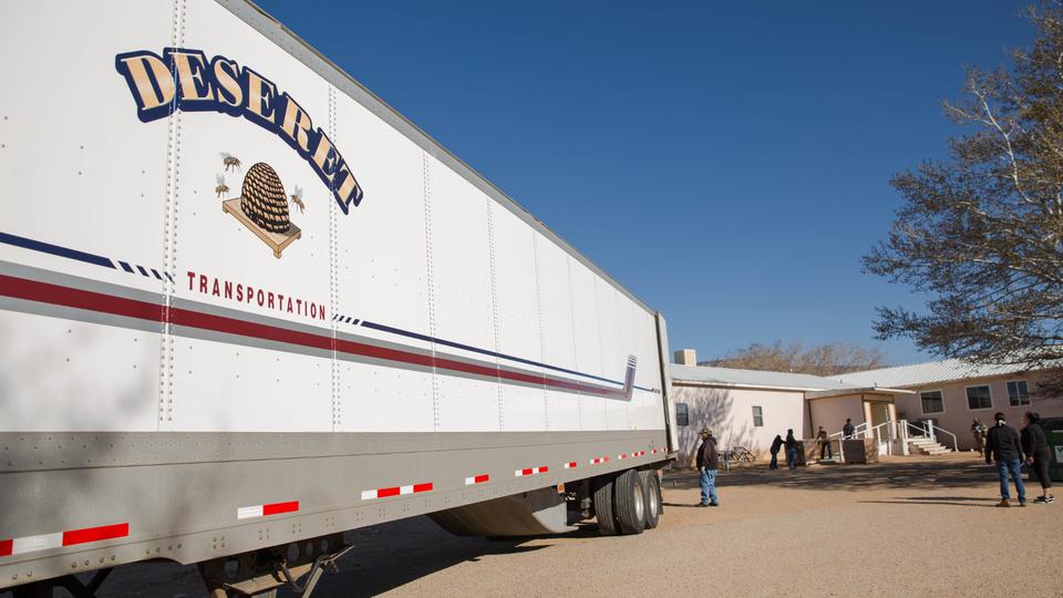 Two Deseret Transportation trucks from Salt Lake City carrying canned goods, flour and pasta arrived at a Pentecostal church in Tohatchi, New Mexico, on Thursday morning, April 2, 2020, for distribution. Members of the Navajo Nation government, a local pastor and Church members worked to unload the products.