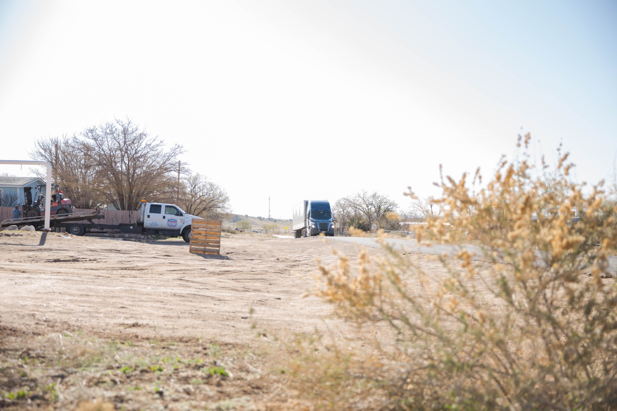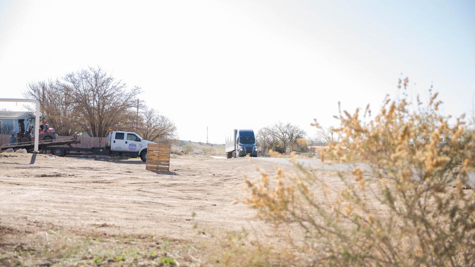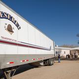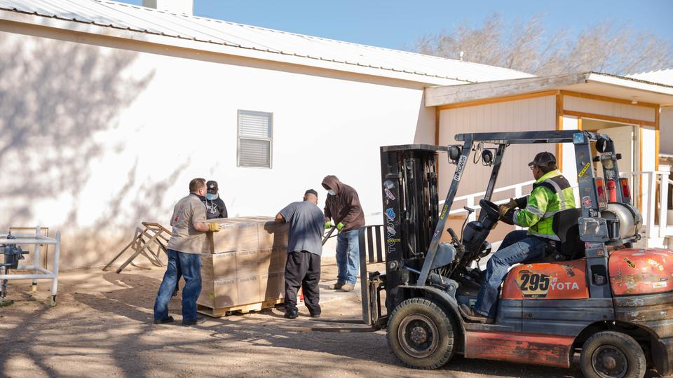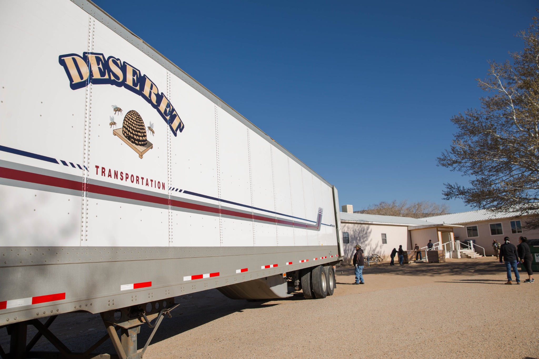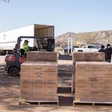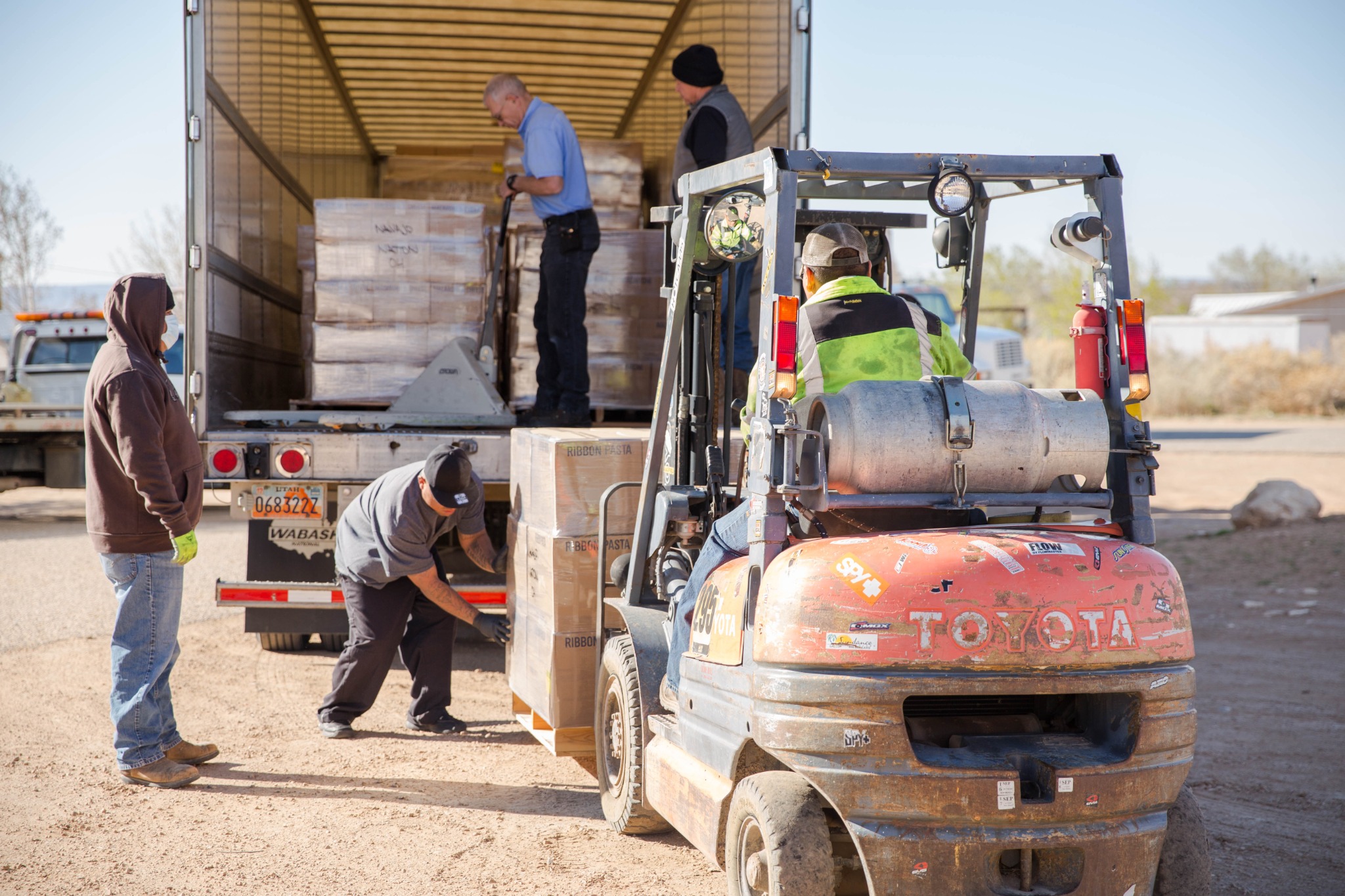 Two Deseret Transportation trucks from Salt Lake City carrying canned goods, flour and pasta arrived at a Pentecostal church in Tohatchi, New Mexico, on Thursday morning, April 2, 2020, for distribution. Members of the Navajo Nation government, a local pastor and Church members worked to unload the products.