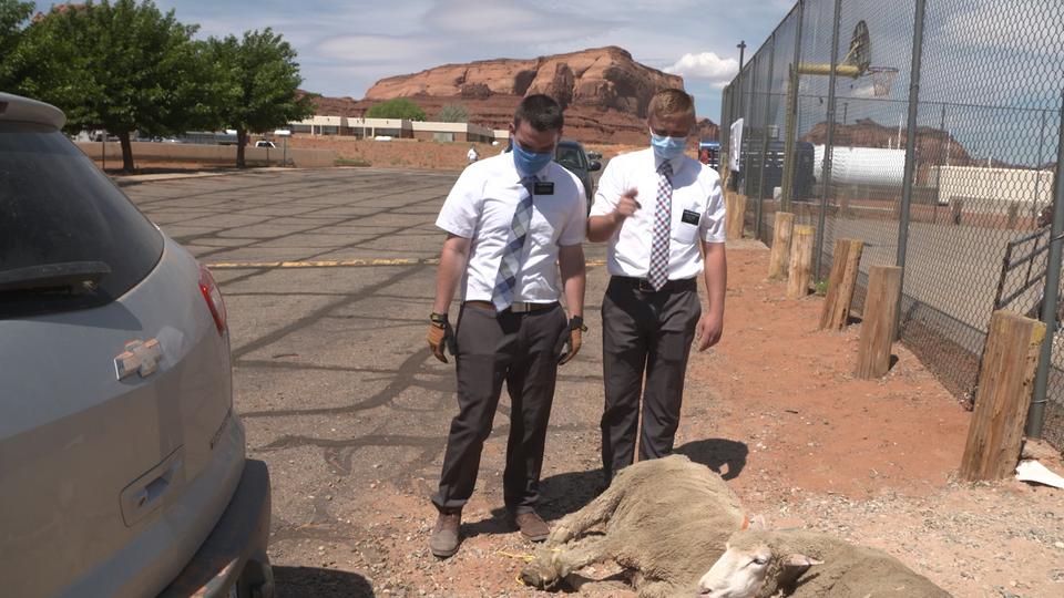 Missionaries in Monument Valley, Utah, help deliver sheep to Navajo families in need on Monday, June 1, 2020. 2020 by Intellectual Reserve, Inc. All rights reserved.“We made it from [the] warehouse in Salt Lake City to homes of the elderly, down long dirt roads to some of the most remote areas on the Navajo Reservation in two days,” said Earl Tulley, a volunteer who assisted with the food deliveries on the eastern portion of the reservation.