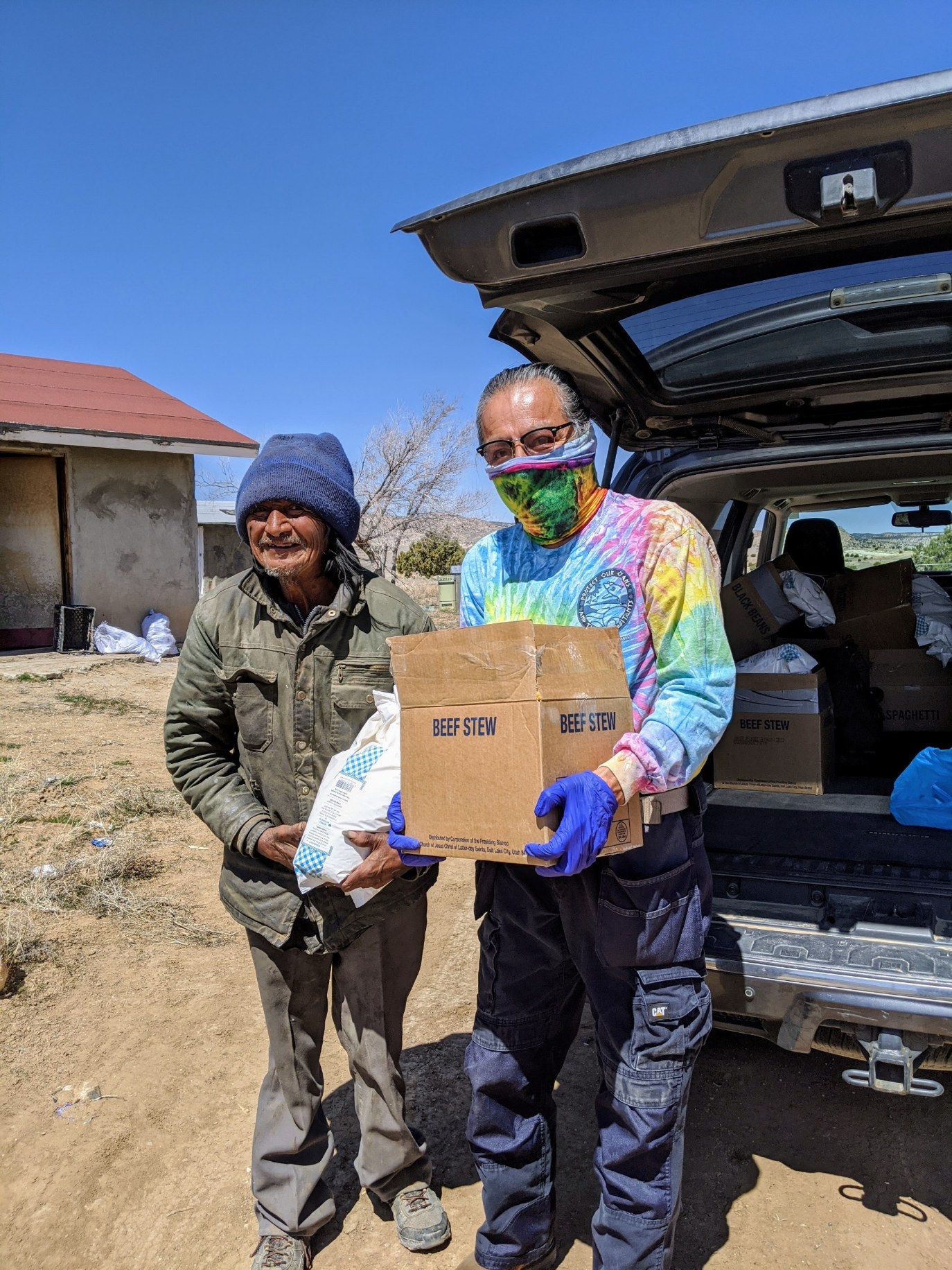 Volunteer Earl Tulley (right) assists with a food delivery on the eastern portion of the Navajo Reservation, Monday, April 6, 2020. All rights reserved.“The majority of the homes in the United States without power and running water are on the Navajo Reservation,” said Elder Todd S. Larkin, Area Seventy, North America Southwest Area. “Limited internet service often makes them the last to be informed in a crisis.”