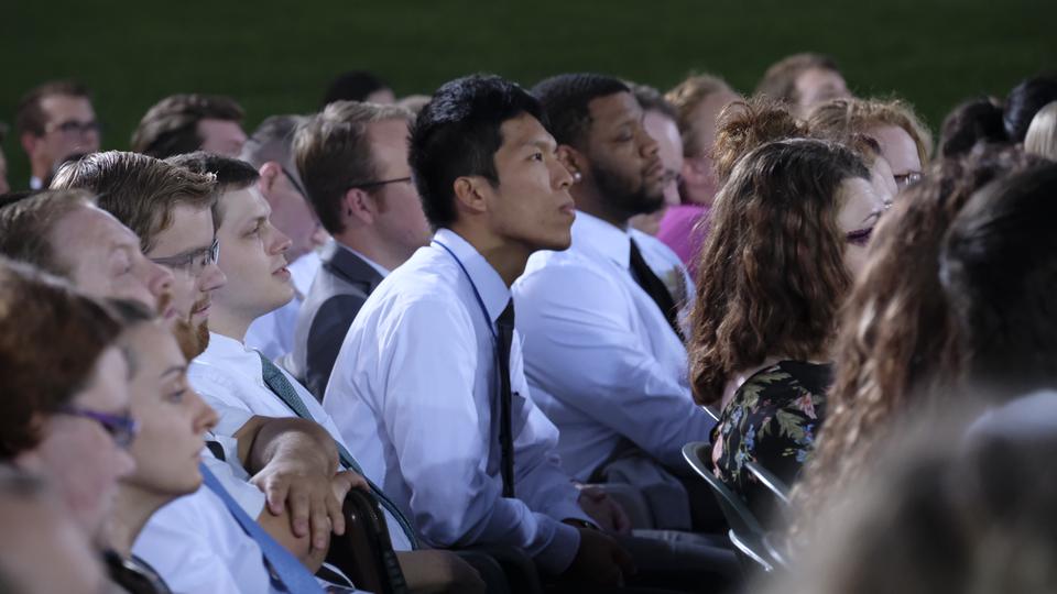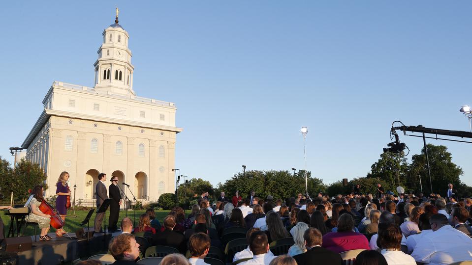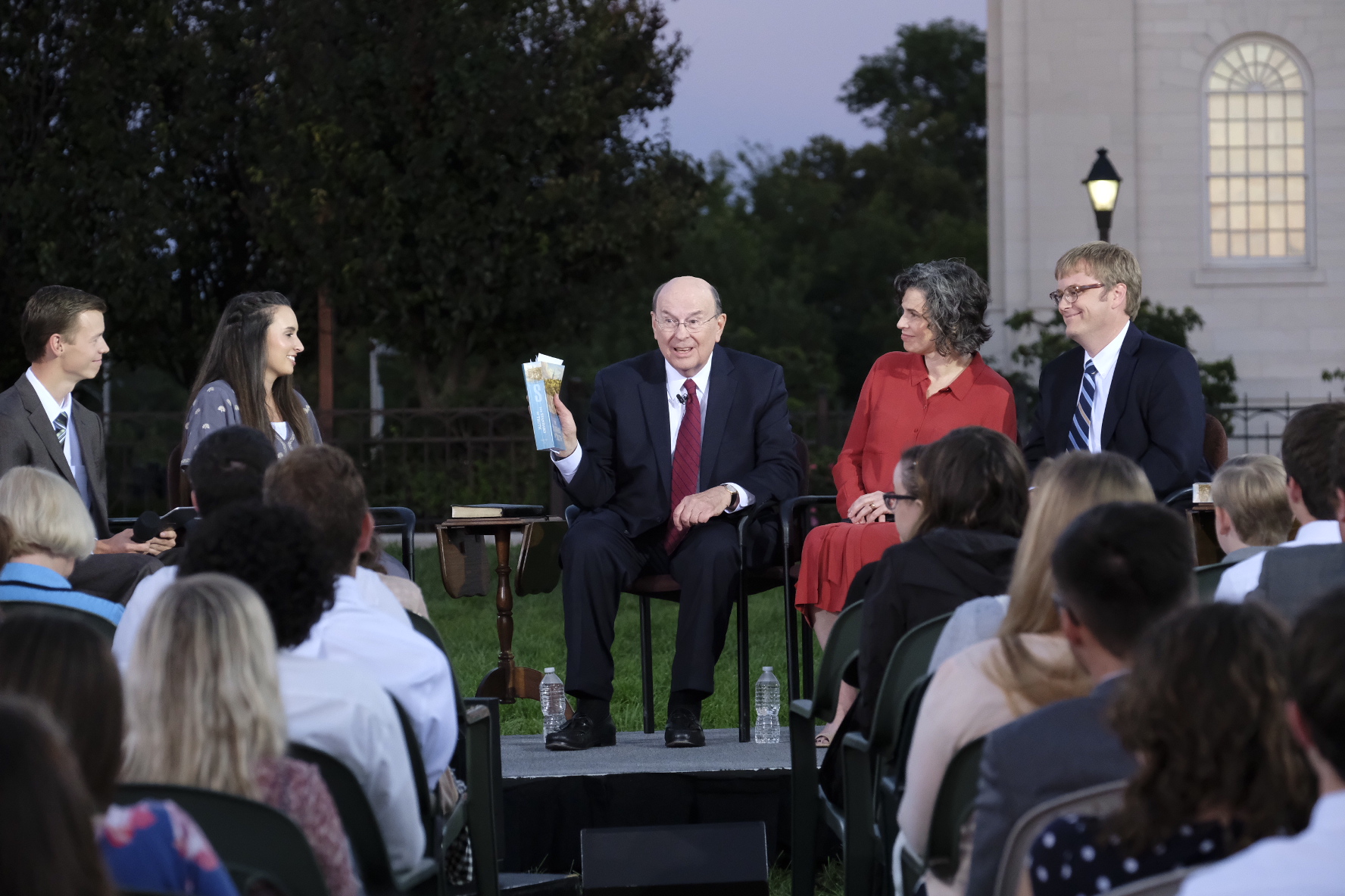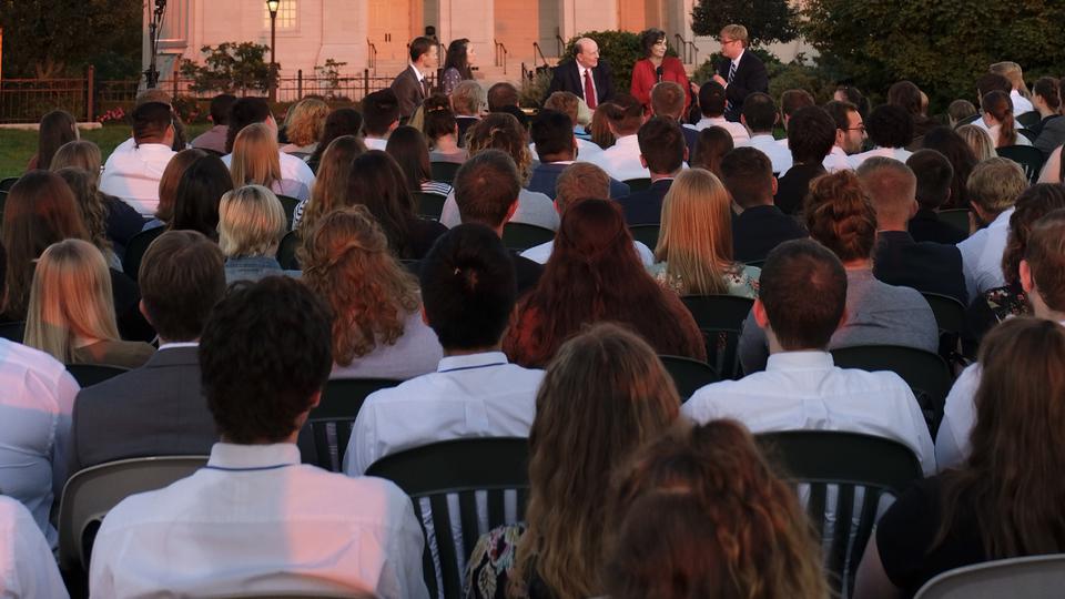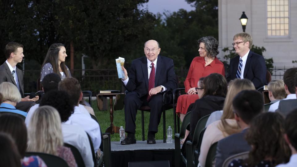 With the majestic Nauvoo Illinois Temple as a backdrop, Elder Quentin L. Cook of the Quorum of the Twelve Apostles hosted an engaging discussion on the history of The Church of Jesus Christ of Latter-day Saints with a group of more than 250 young adults in a live Face to Face devotional Sunday evening, September 9, 2018, broadcast throughout the world. They were outdoors in the historic location along the shores of the Mississippi River.