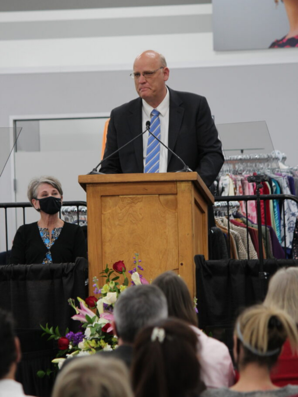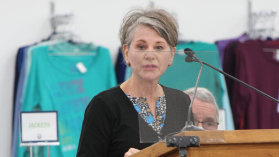 Debera Nicodemus, Tucson Arizona North Stake Relief Society president, speaks at the dedication of the new Welfare and Self-Reliance Services facility in Marana, Arizona, on February 9, 2022. Photo by Scott Adair, courtesy of Church News.All rights reserved.Bishop Greenland said perhaps the most important thing about Deseret Industries is the way people are treated.