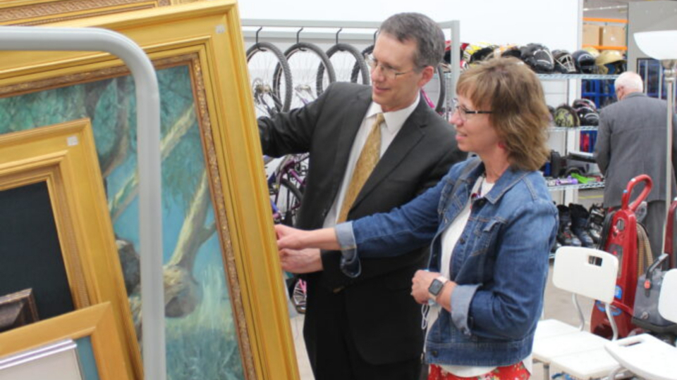 Bishop Chad Boyack and his wife, Allison, of the Continental Ranch Ward, Marana Arizona Stake, peruse items for sale at the new Deseret Industries in Marana, Arizona, on February 9, 2022. All rights reserved.Copyright 2022 Deseret News Publishing Company.