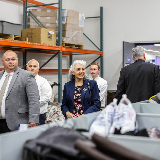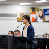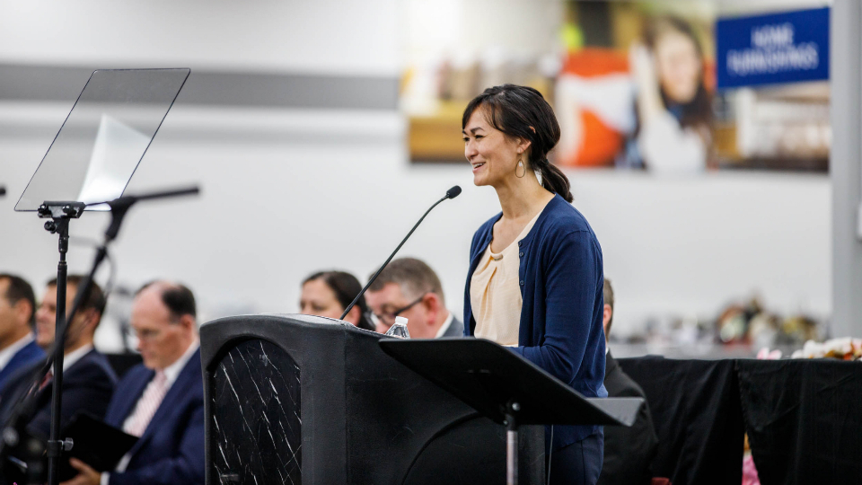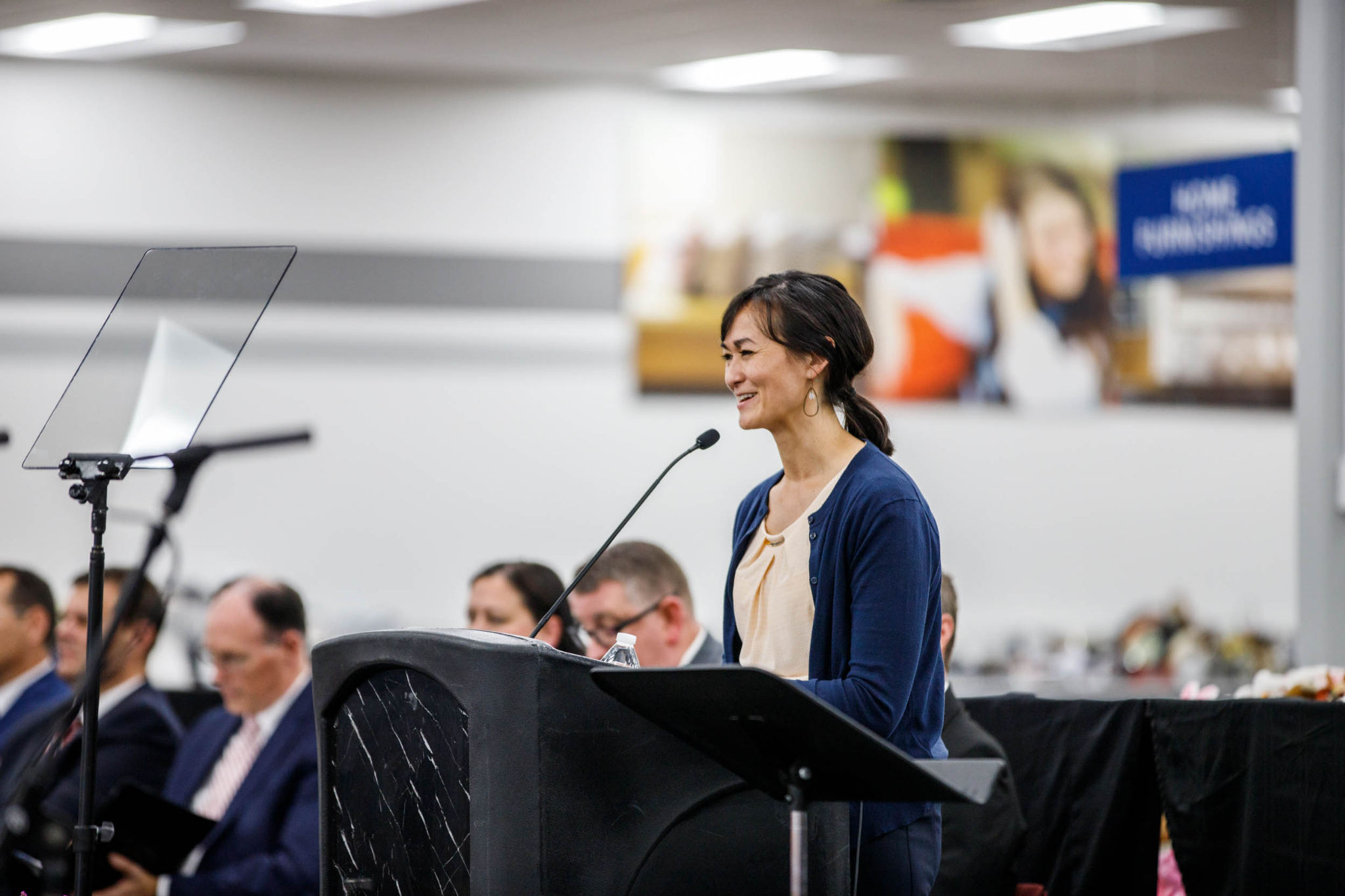 Sister Kristin M. Yee, Second Counselor in the Relief Society General Presidency, speaks during the dedication program for a new Welfare and Self-Reliance Services facility in Saratoga Springs, Utah, on September 14, 2022.2022 by Intellectual Reserve, Inc. All rights reserved.Sister Yee shared examples of associates, missionaries and employees blessed by Deseret Industries.