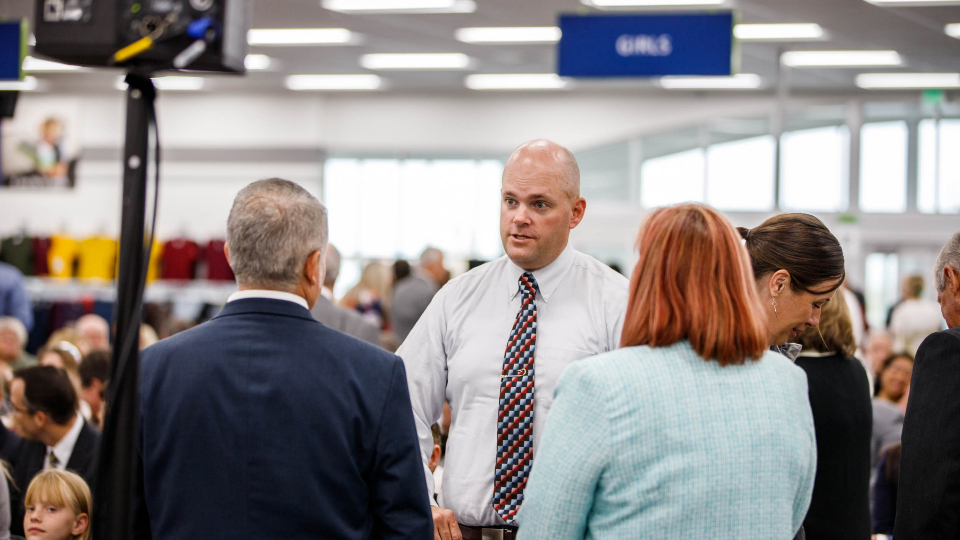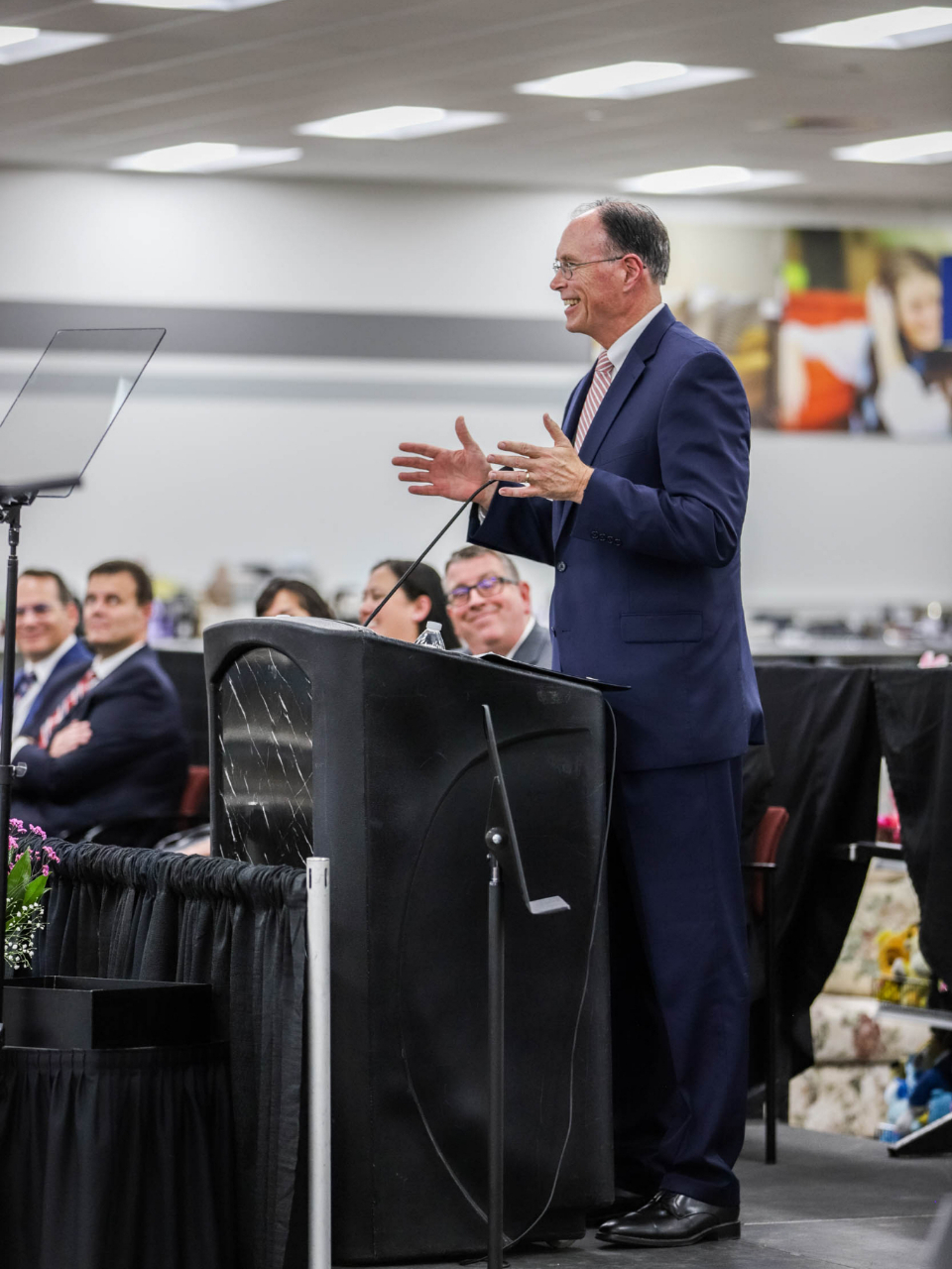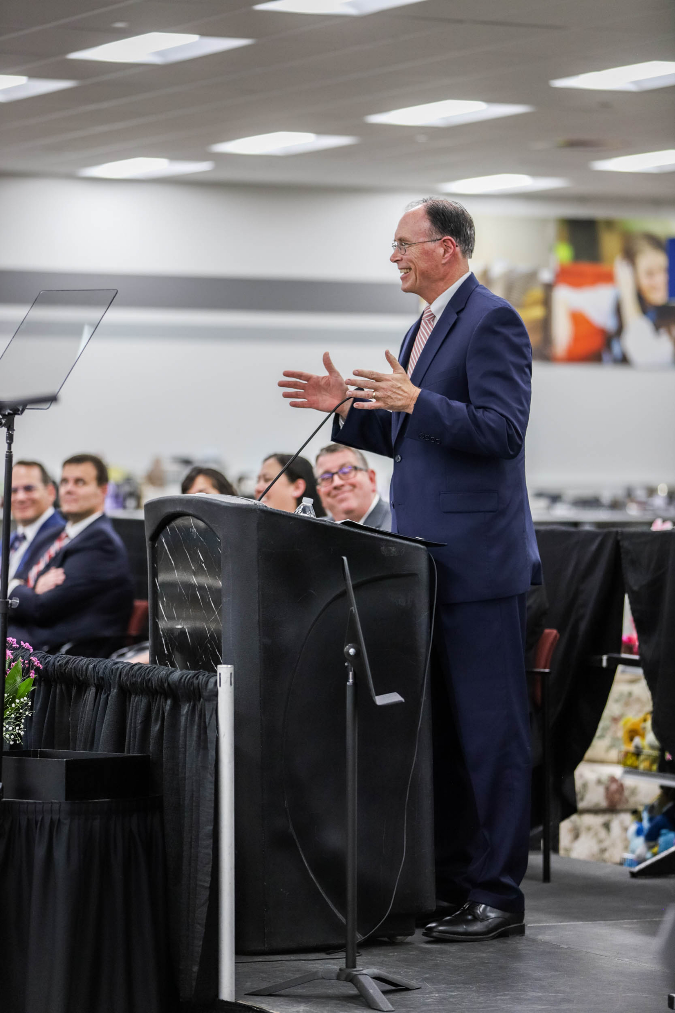 Bishop W. Christopher Waddell, First Counselor in the Presiding Bishopric, shares stories of Deseret Industries associates during the dedication program for the new Welfare and Self-Reliance Services facility in Saratoga Springs, Utah, on September 14, 2022.2022 by Intellectual Reserve, Inc. All rights reserved.“This new facility — the Saratoga Springs Deseret Industries complex — is all about caring for the one,” Bishop Waddell said in his remarks during the dedication program.