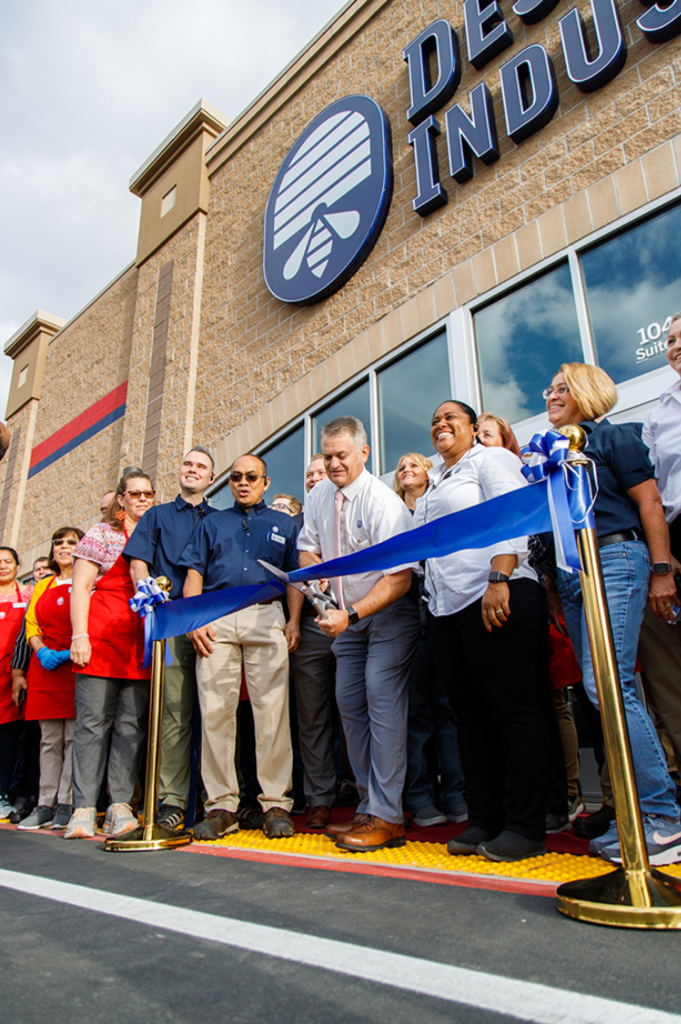 Staff, missionaries and volunteers pose in front of the new Deseret Industries and Welfare and Self-Reliance Services facility in Saratoga Springs, Utah, following the ribbon-cutting ceremony on Thursday, September 15, 2022.2022 by Intellectual Reserve, Inc. All rights reserved.