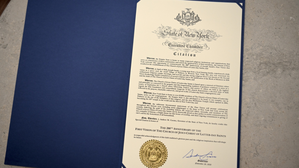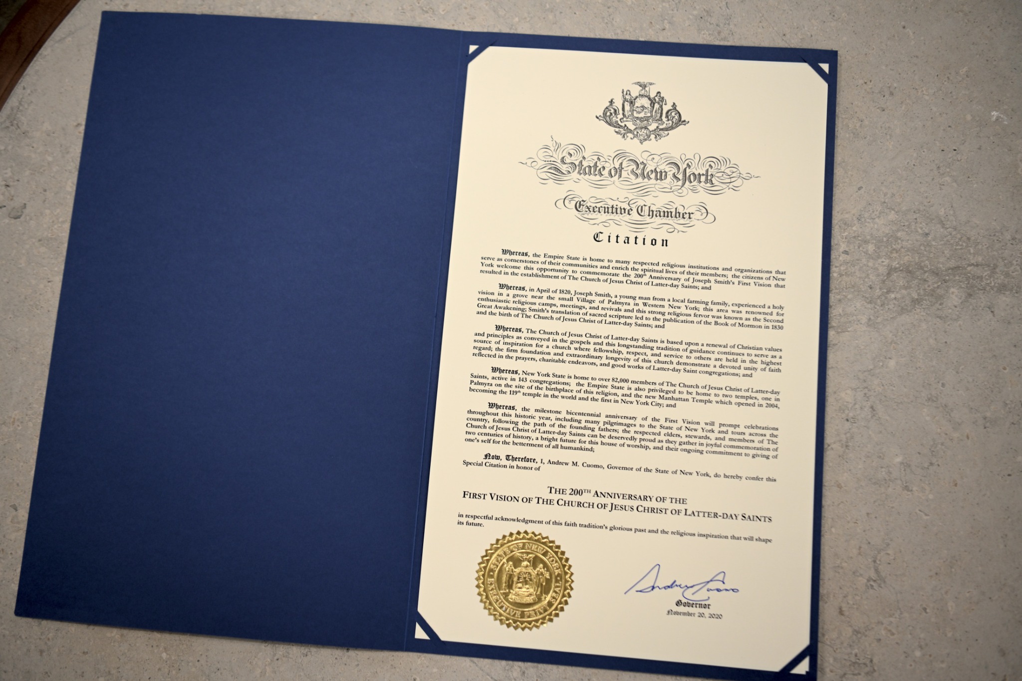 In December, the Church received a citation issued by New York Governor Andrew M. Cuomo recognizing the bicentennial of the First Vision.