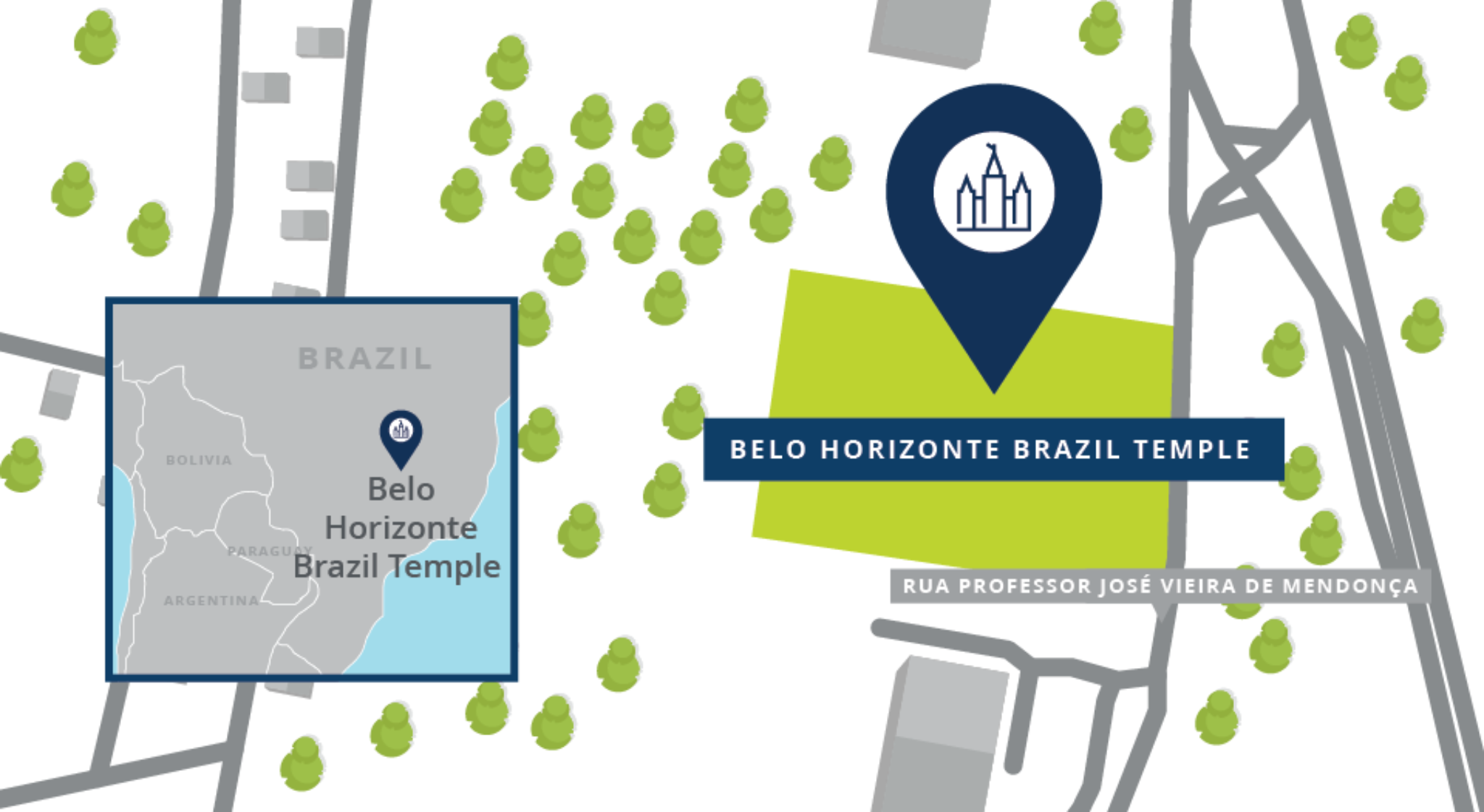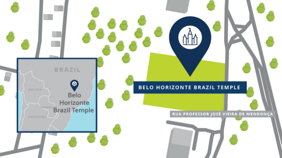 The Belo Horizonte Brazil Temple will be built on an 11.9-acre site located at Rua Professor José Vieira de Mendonça, 1485 - Engenho Nogueira, Belo Horizonte. Plans call for a single-story temple of approximately 26,884 square feet. Church President Russell M. Nelson first announced this house of the Lord in April 2021.