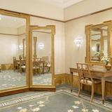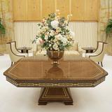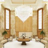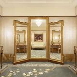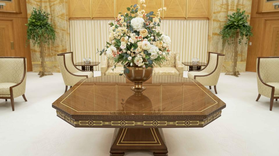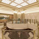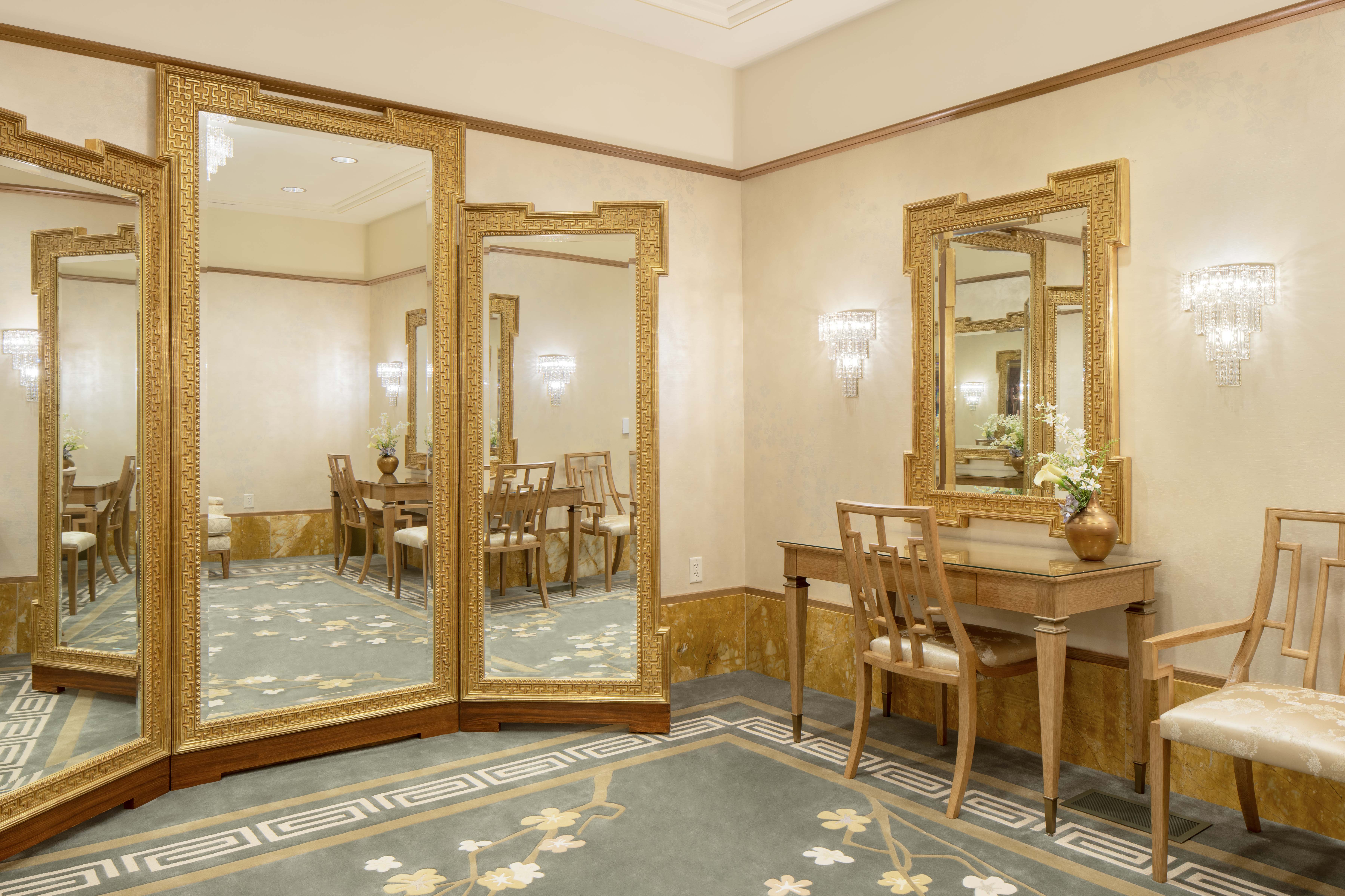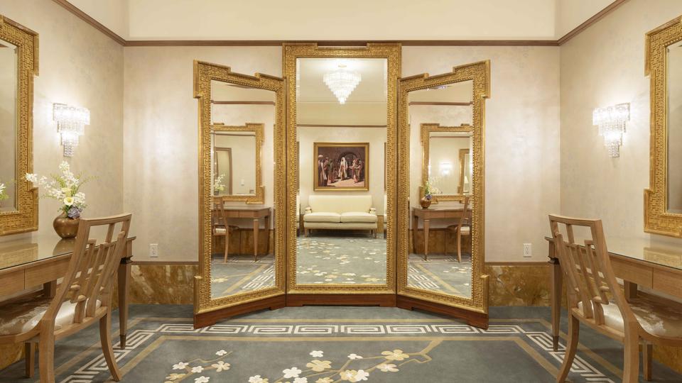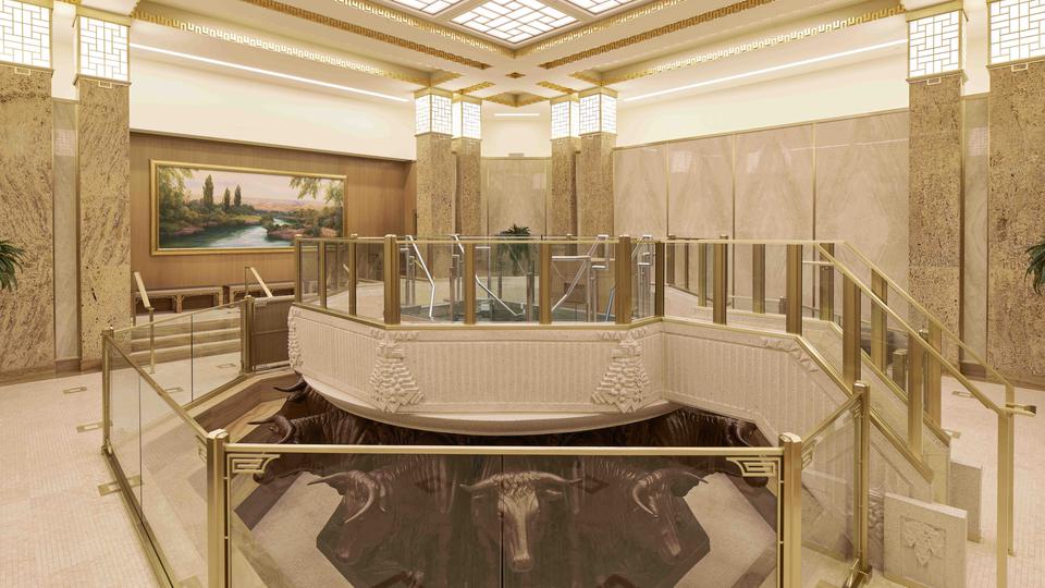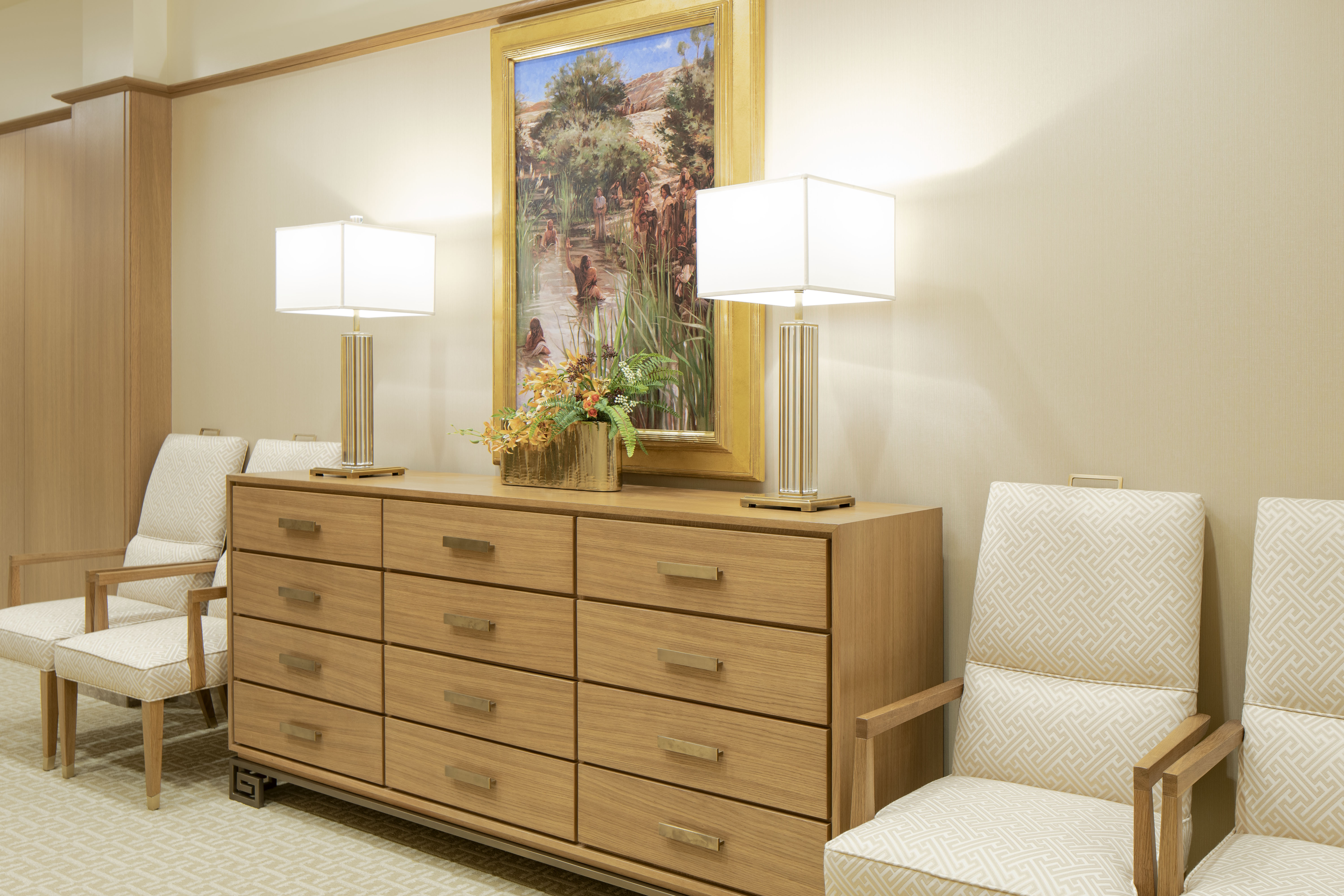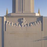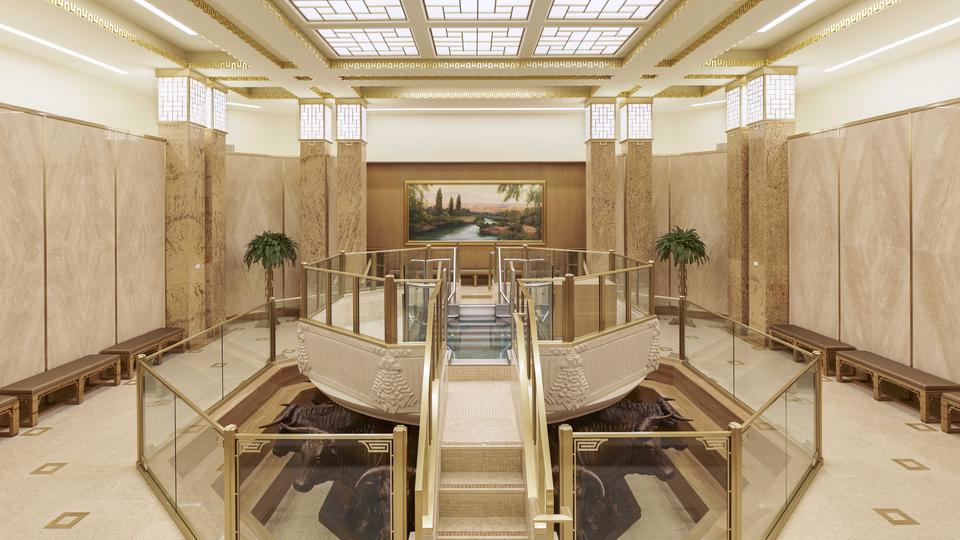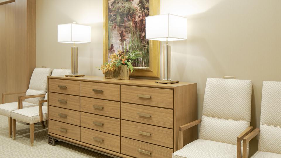 The temple’s interior materials come from around the world. The flooring stone is from Greece, China and Georgia. Paints were manufactured in California and Ohio, and decorative painting was done by companies in Utah and New York. Lighting was designed by companies in Minnesota, New York and Utah. The doors of the celestial room are primavera wood from South America, and some sealing rooms feature ribbon-striped mahogany from Africa. All doors have custom bronze hardware made of Indian brass. The original artwork in the temple is from Italy and Utah.