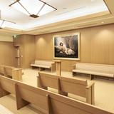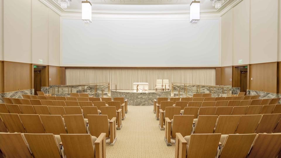 True to the intentions of the modern era, the interior of the temple is carefully restrained in its ornamentation. The fineness of the natural material enhances the symbolic progression of the sacred space, each material minimally altered and finished to show its intrinsic beauty. This is evident in the use of wood and stone, where clean, geometric designs are used sparingly. The original woods are not stained, only sealed, to show the original color and grain.