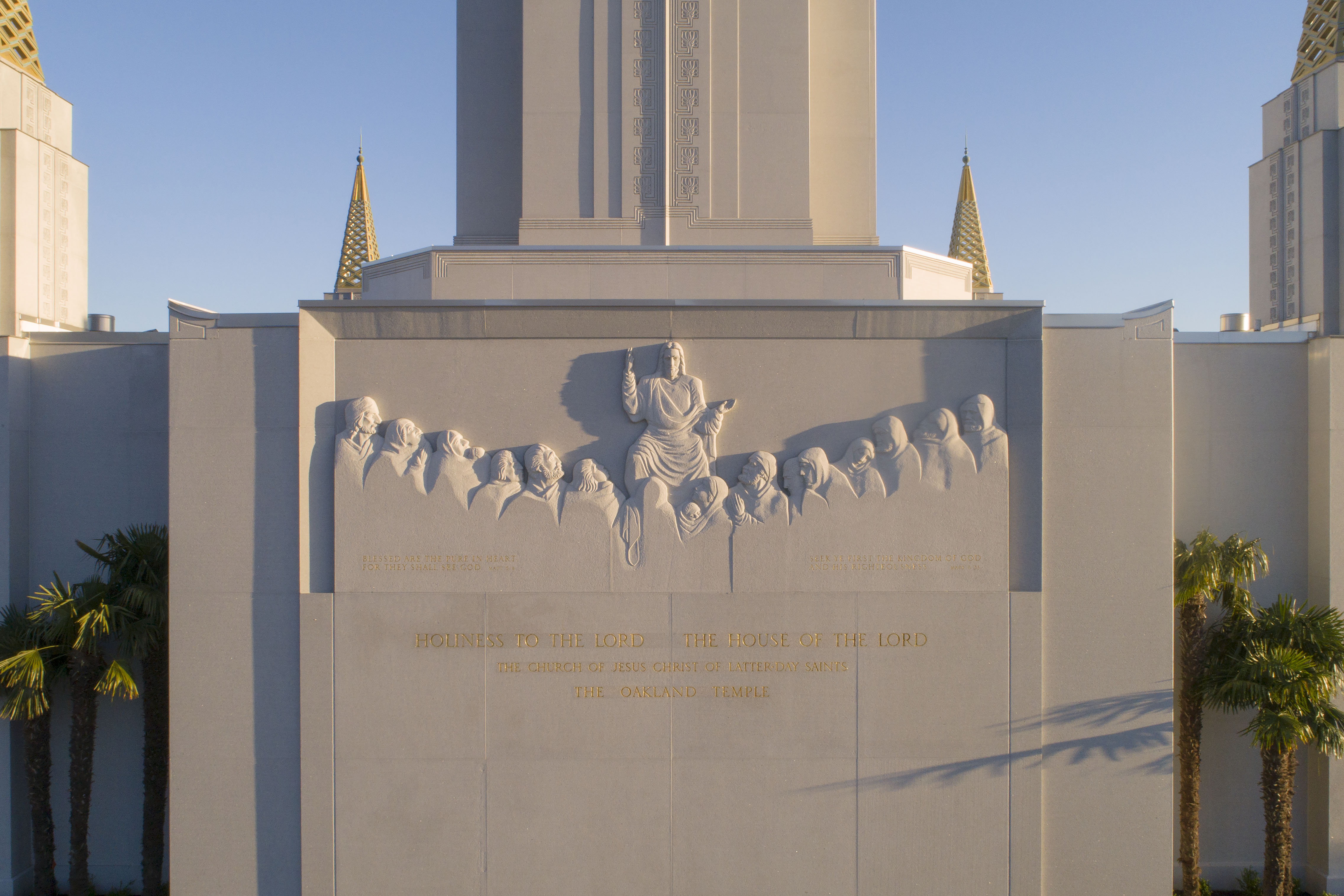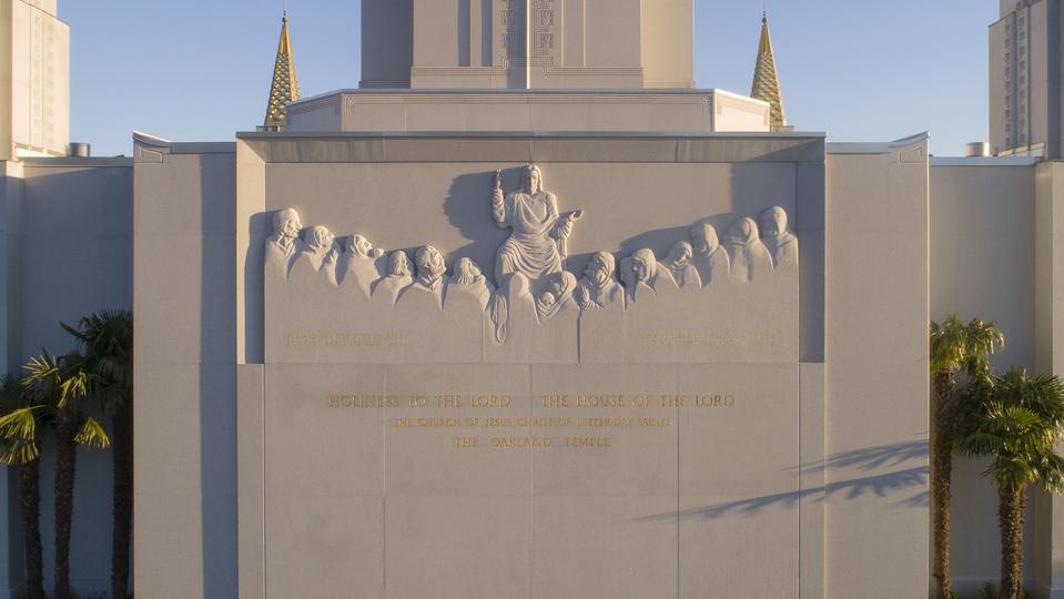 The original temple exterior points to Jesus Christ and the diversity of the area. The relief sculpture on the north side ornaments the building and depicts Christ teaching as found in Matthew 5 and 6. The relief sculpture on the south side shows the Savior as described in 3 Nephi 11 of the Book of Mormon. And Burton’s five-spire design hints at buildings in the Far East, such as the Taj Mahal in India and Angkor Wat in Cambodia, and reflects the diversity of Northern California’s residents.