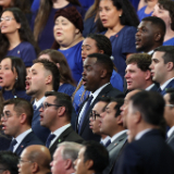 Music was provided by a choir comprised of members throughout the Utah Area, under the direction of Kelly DeHaan and Manu Harris, with Linda Margetts and Joseph Peeples at the organ. Elder Jörg Klebingat and Elder I. Raymond Egbo, both General Authority Seventies, gave the prayers.