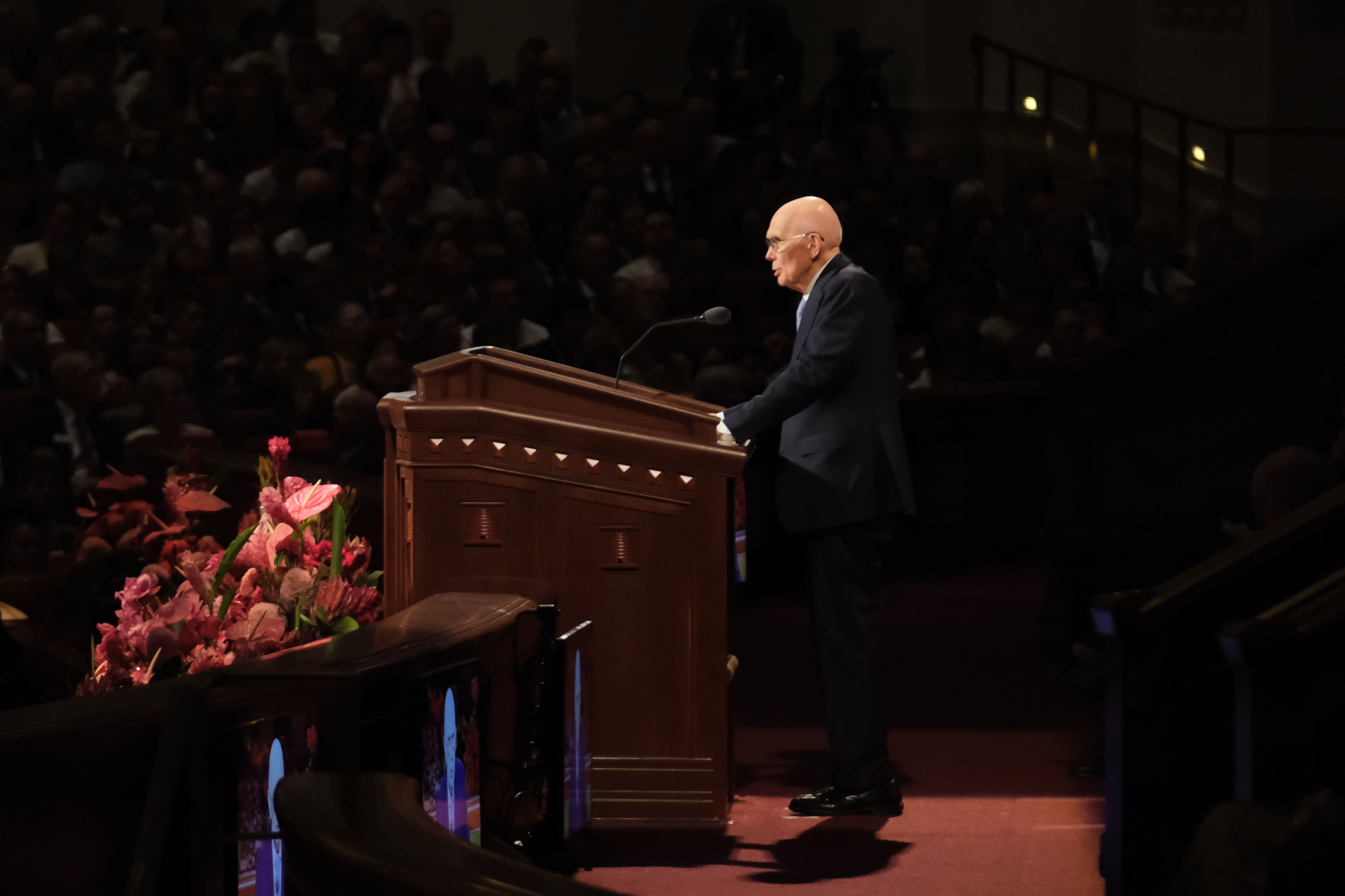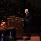 The President of the Quorum of the Twelve Apostles said the Church will “move forward in providing the ordinances of the temple to members of the Church throughout the world, including when and where to announce the construction of new temples.” He did not announce any new temples during his remarks, noting that “with the large number of temples now in the very earliest phases of planning and construction, it is appropriate that we slow down the announcement of new temples.”