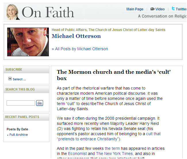The “On Faith” blog post asks, if the word “cult” has no currency in academia, why some journalists keep repeating it. "Because it’s a neat, shorthand and rather lazy way of putting a whole group into a box. Once labeled as a cult, there is not much need to explain all of the baggage that comes with it. … Rather than continuing to parrot it, it’s time they pushed back against those who choose to use it.”