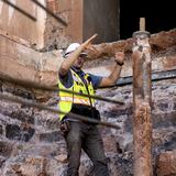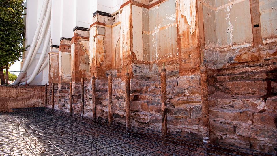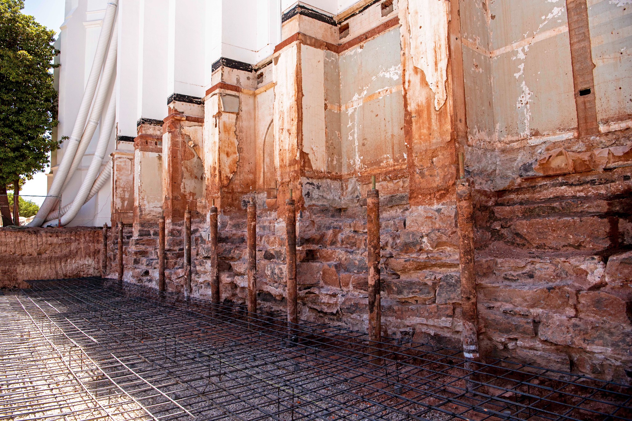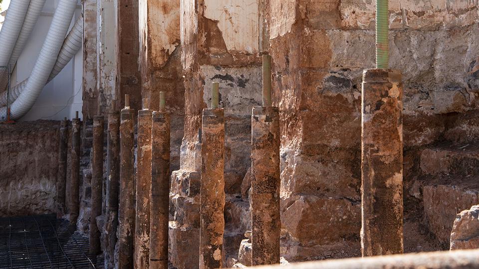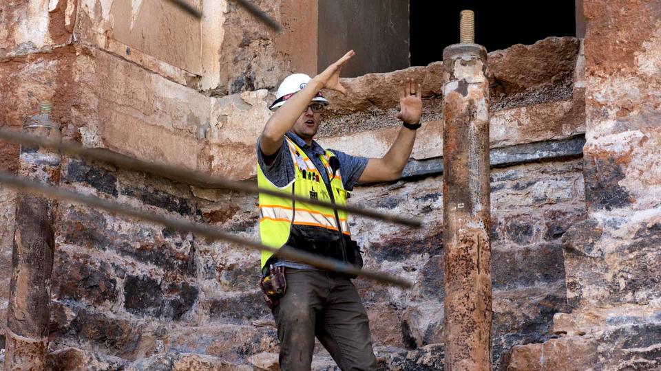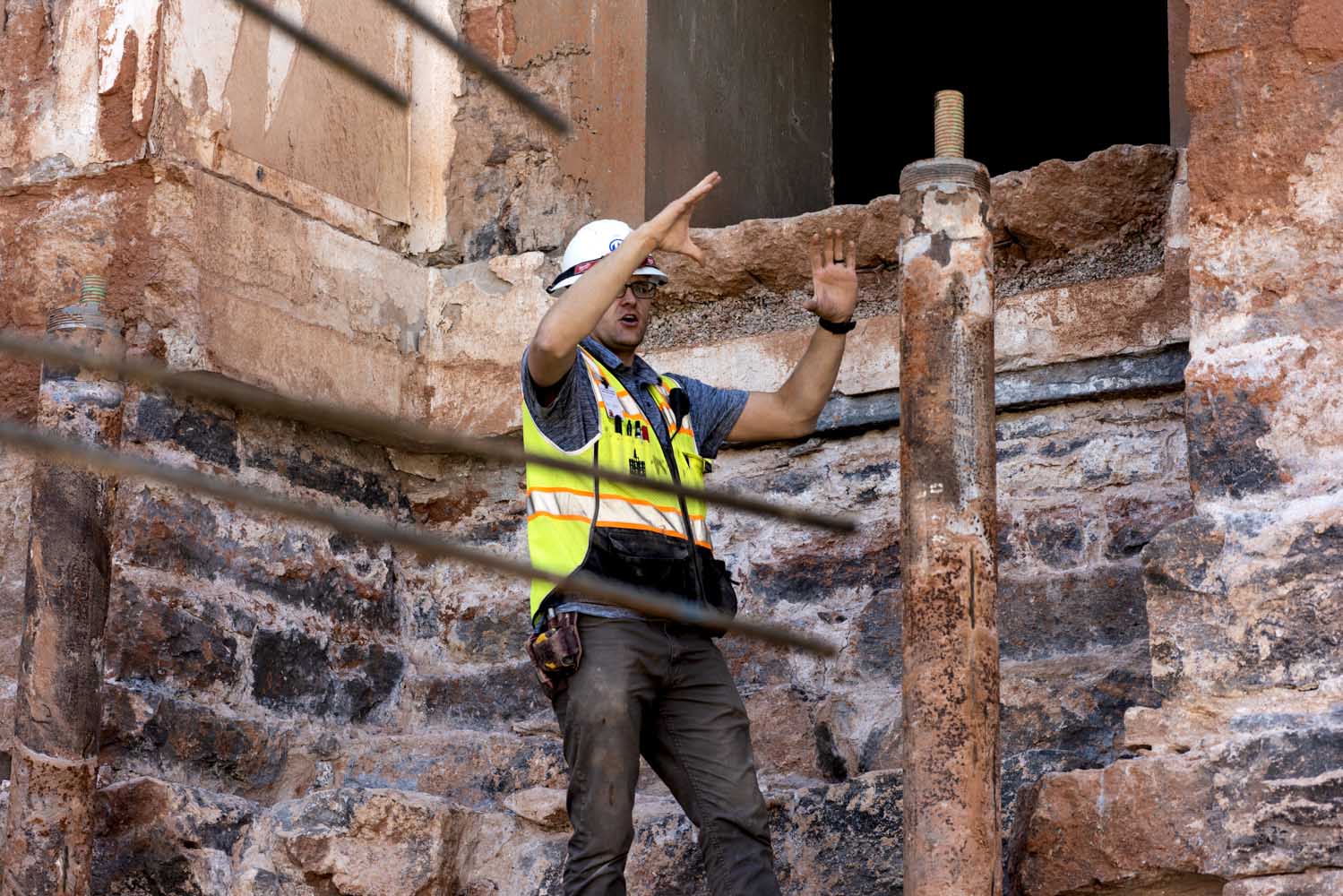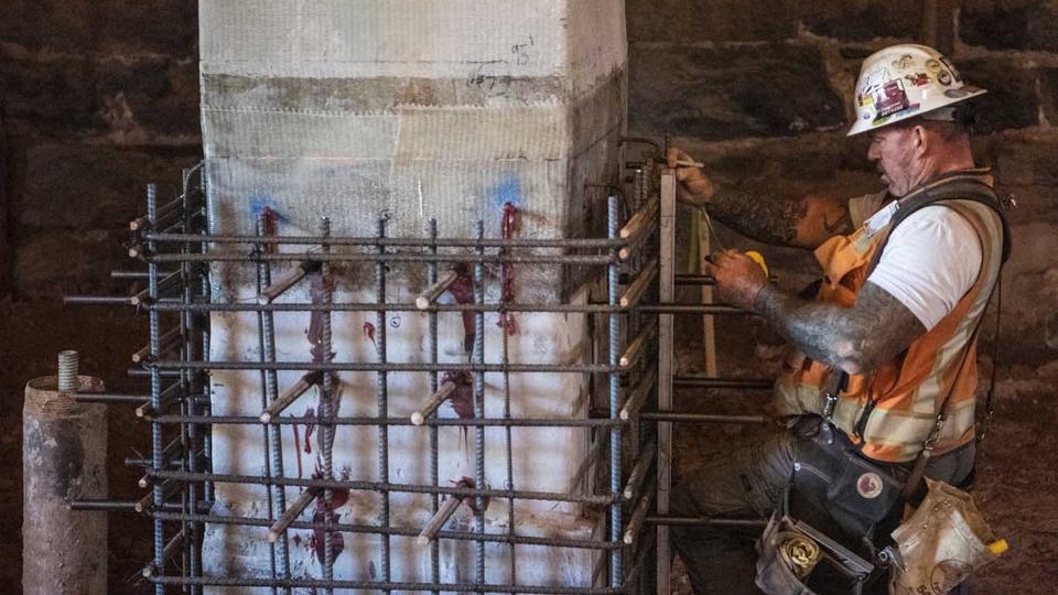 Shoring up the hand-laid rock foundation was another significant accomplishment in the last several months. The temple’s foundation and 14 stone columns were reinforced to improve stability by cladding support beams with steel, wrapping columns with resin-infused fiberglass and flanking each corner with steel pipes called micropiles.