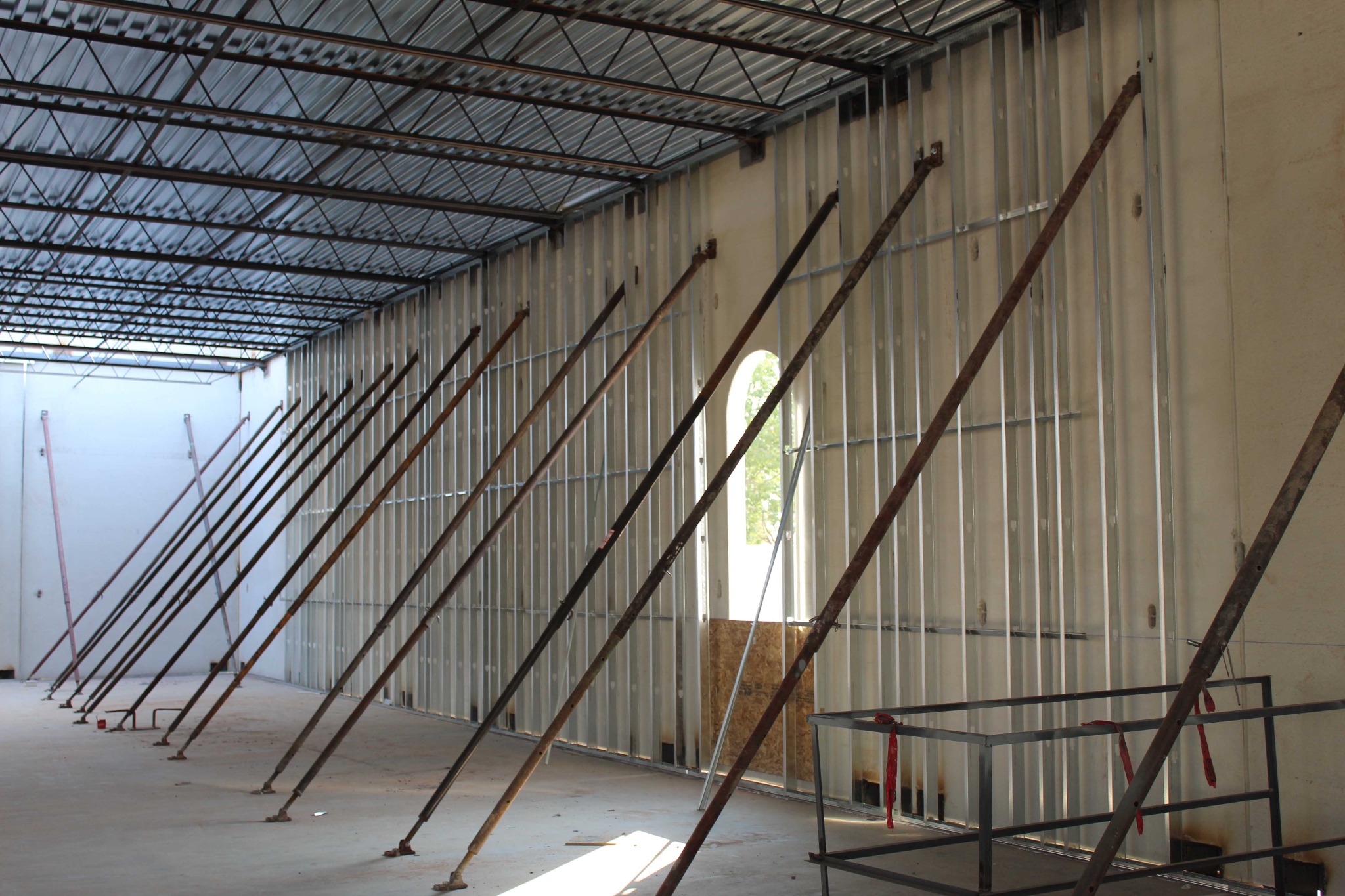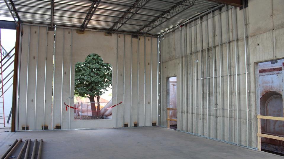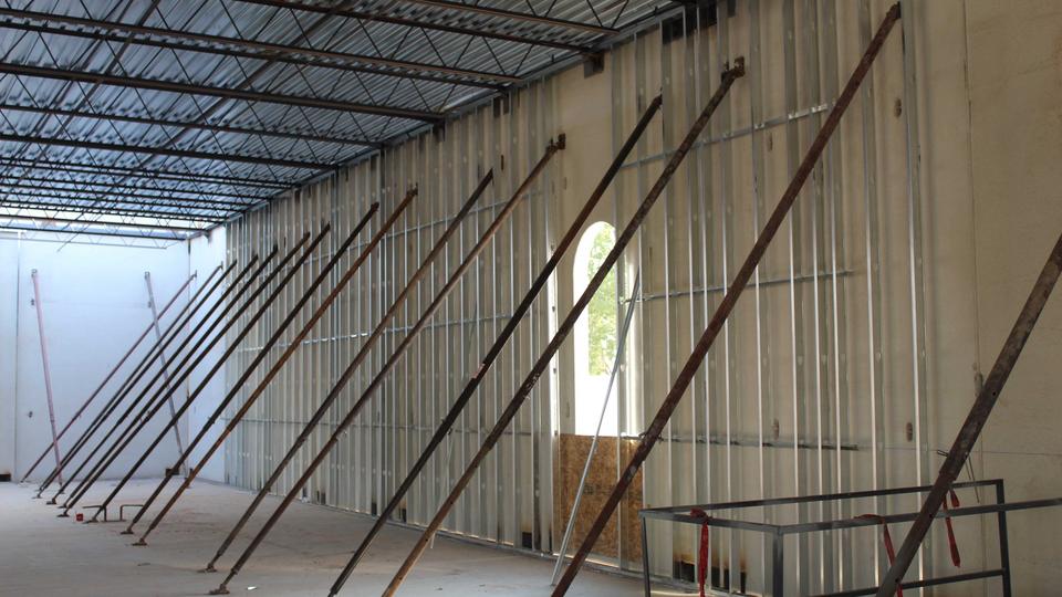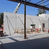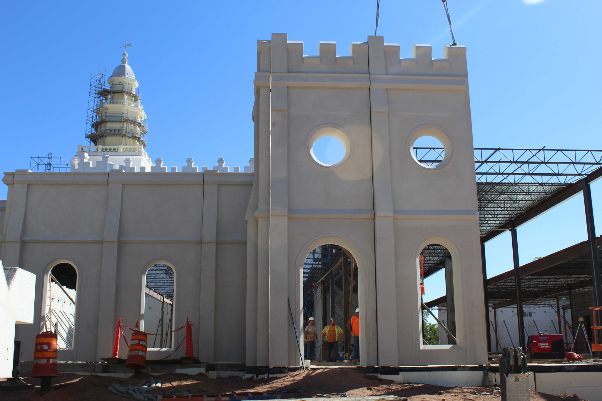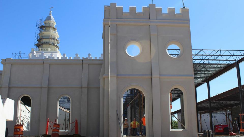 The most noticeable transformation is the installation of the precast walls that reflect the same pillared design cues and trademark circular windows as the temple itself. Installation crews are also adding metal stud partition walls to the interior of the north entrance addition.