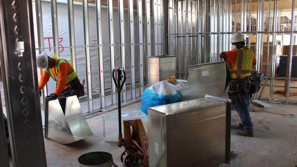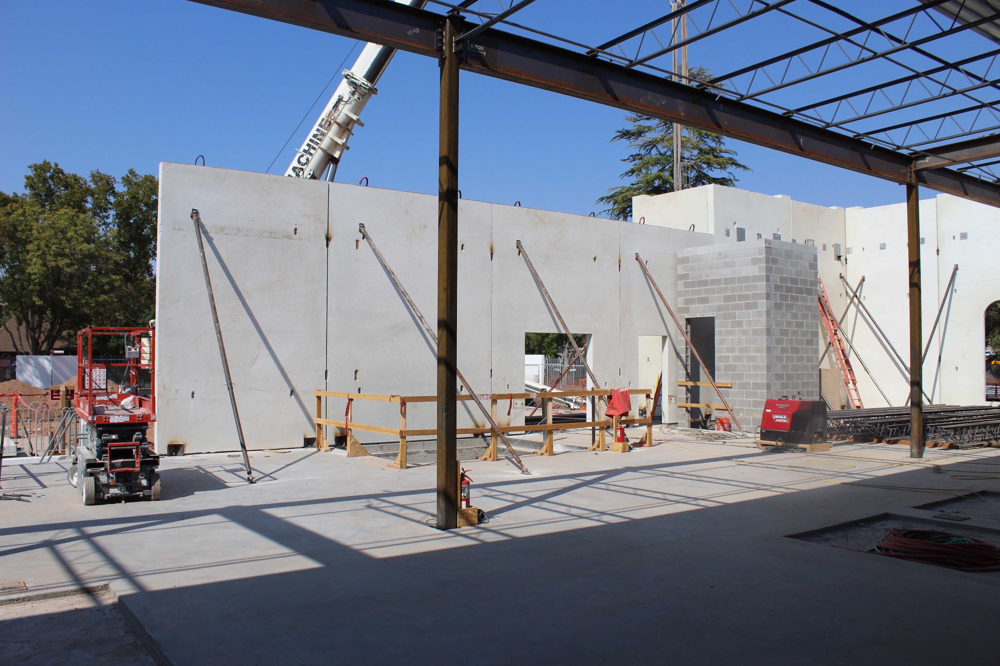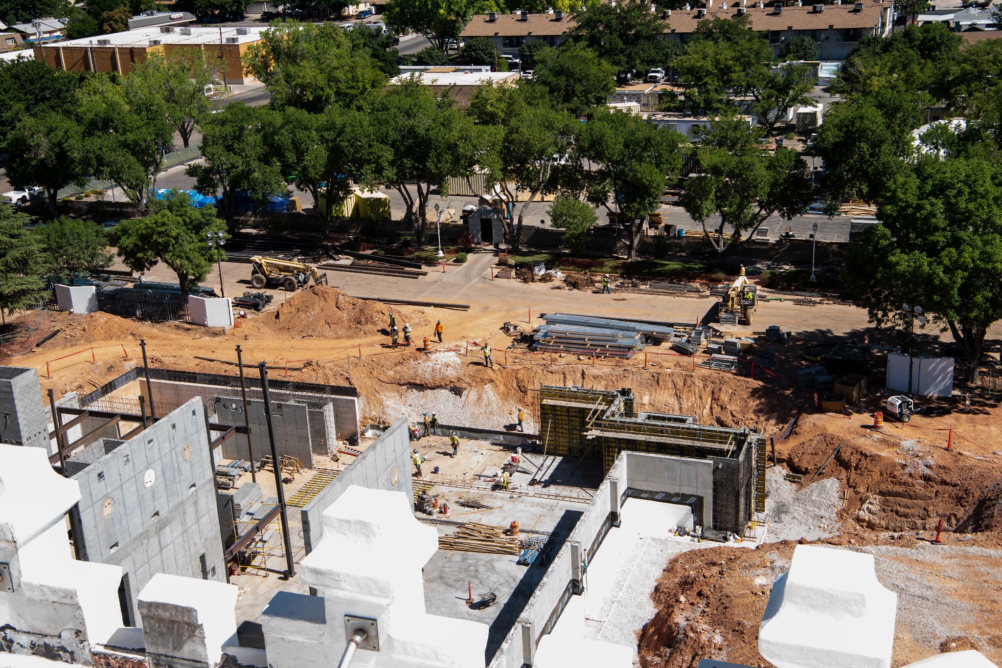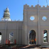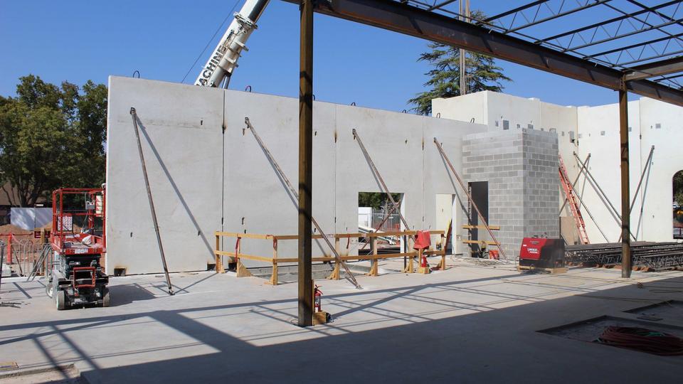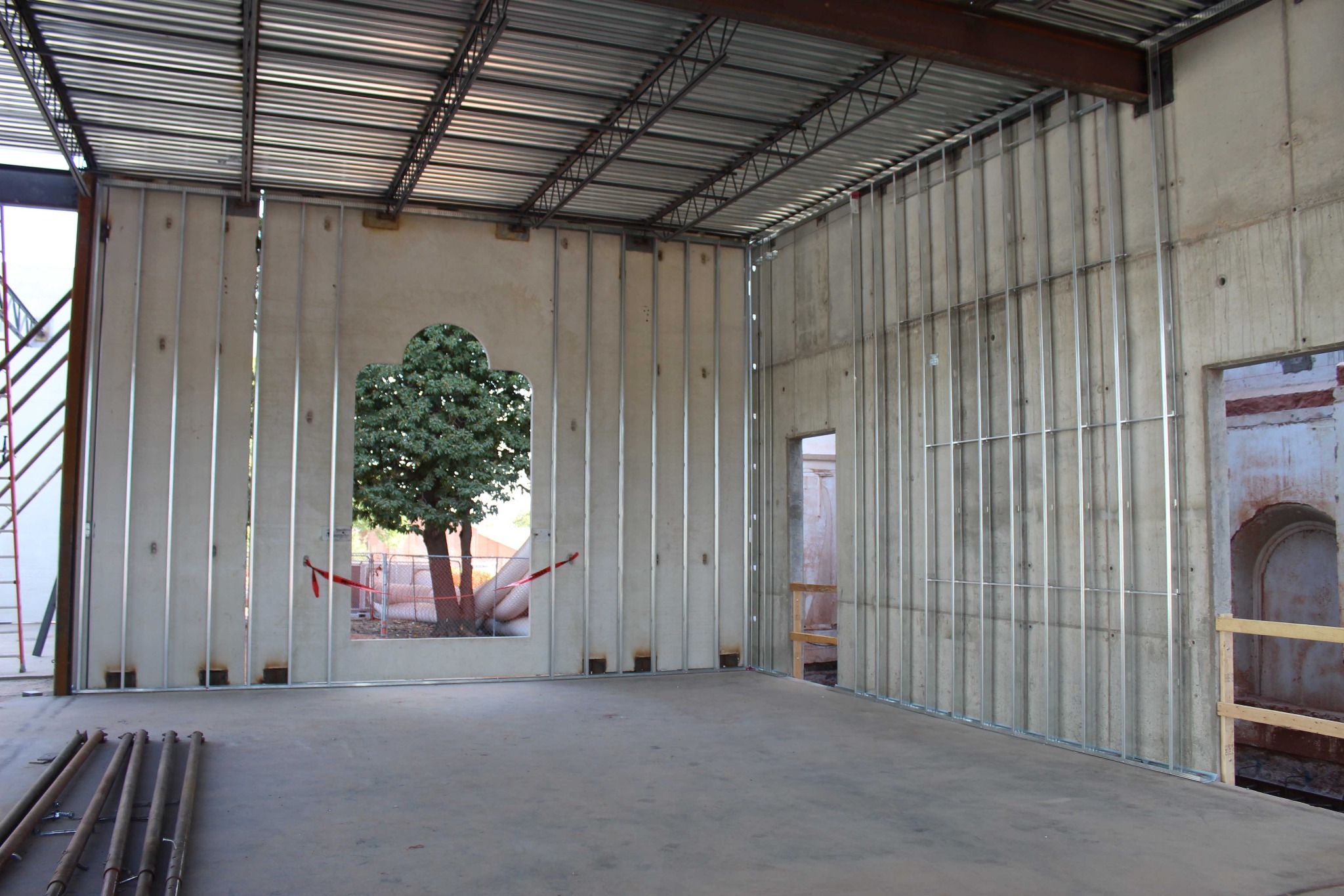 The most noticeable transformation is the installation of the precast walls that reflect the same pillared design cues and trademark circular windows as the temple itself. Installation crews are also adding metal stud partition walls to the interior of the north entrance addition.